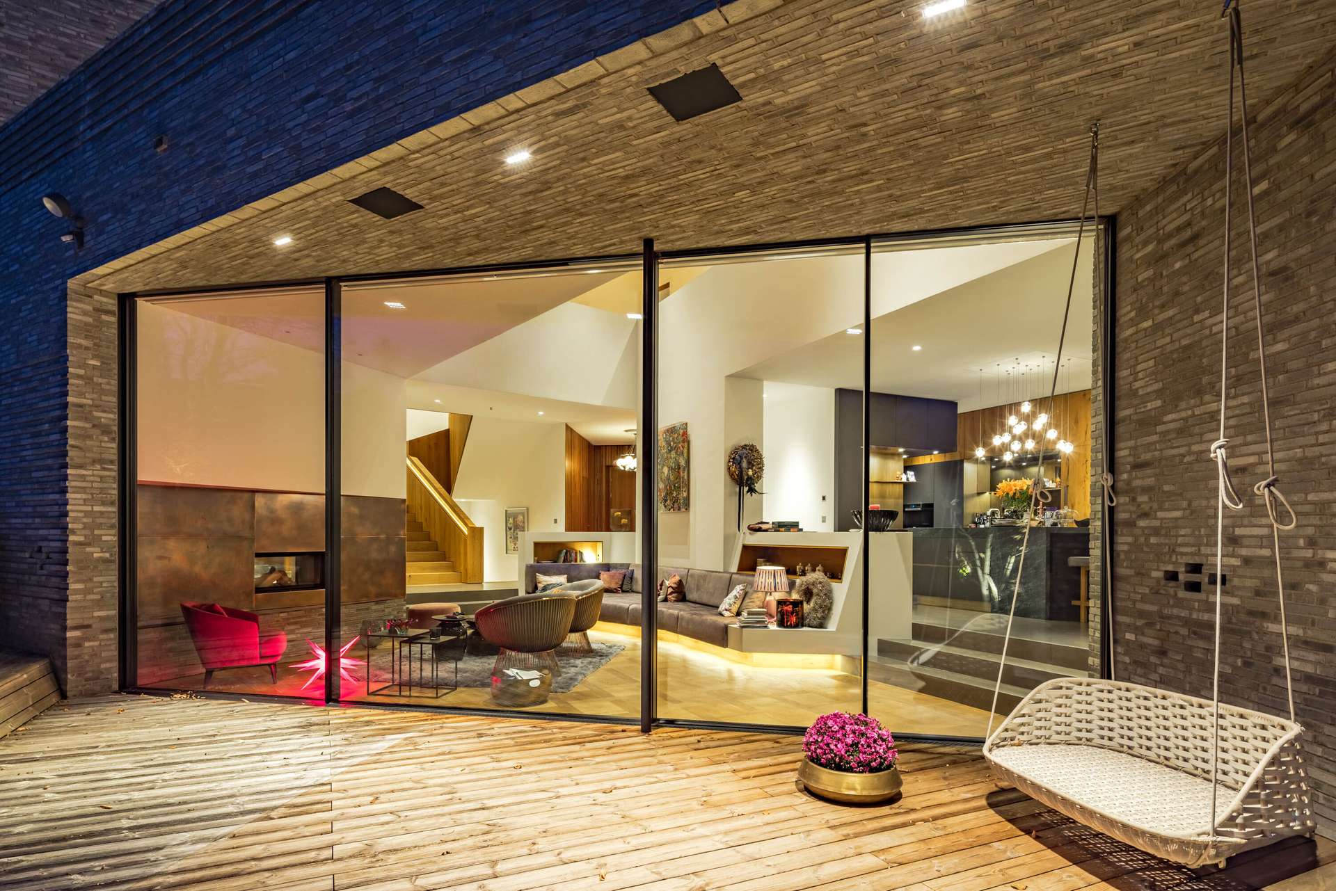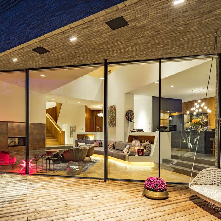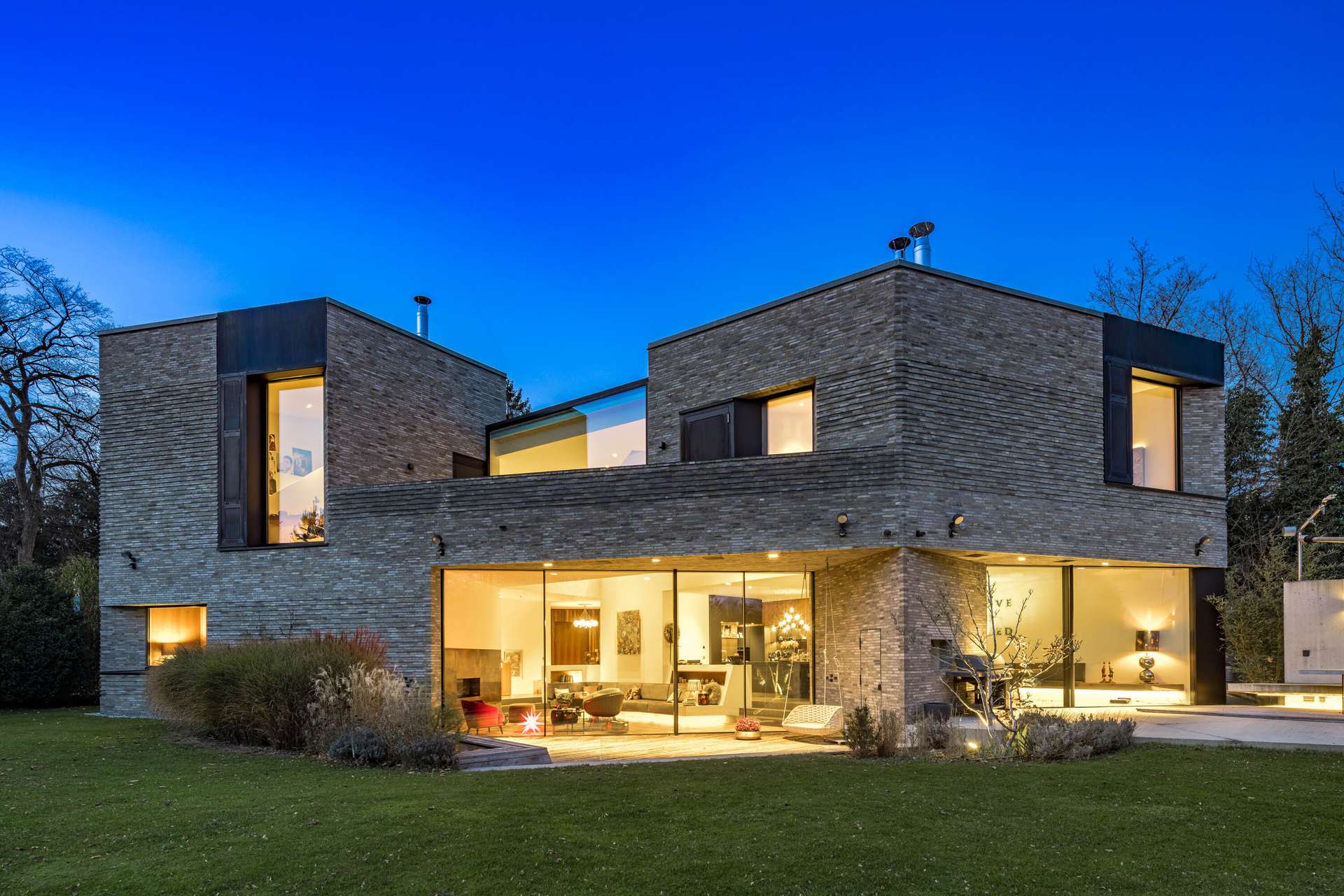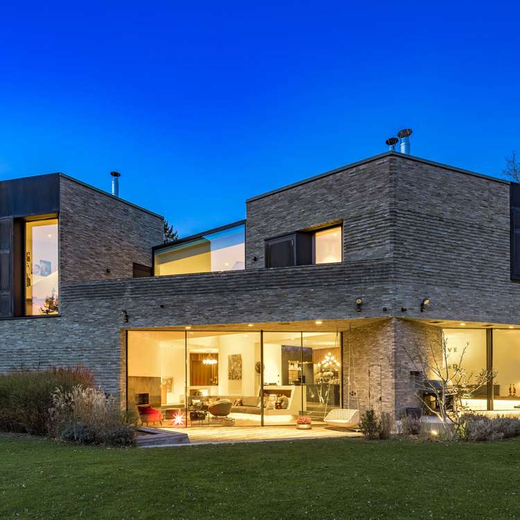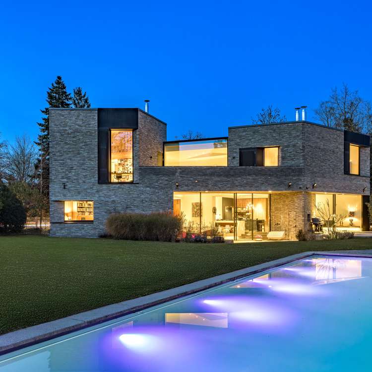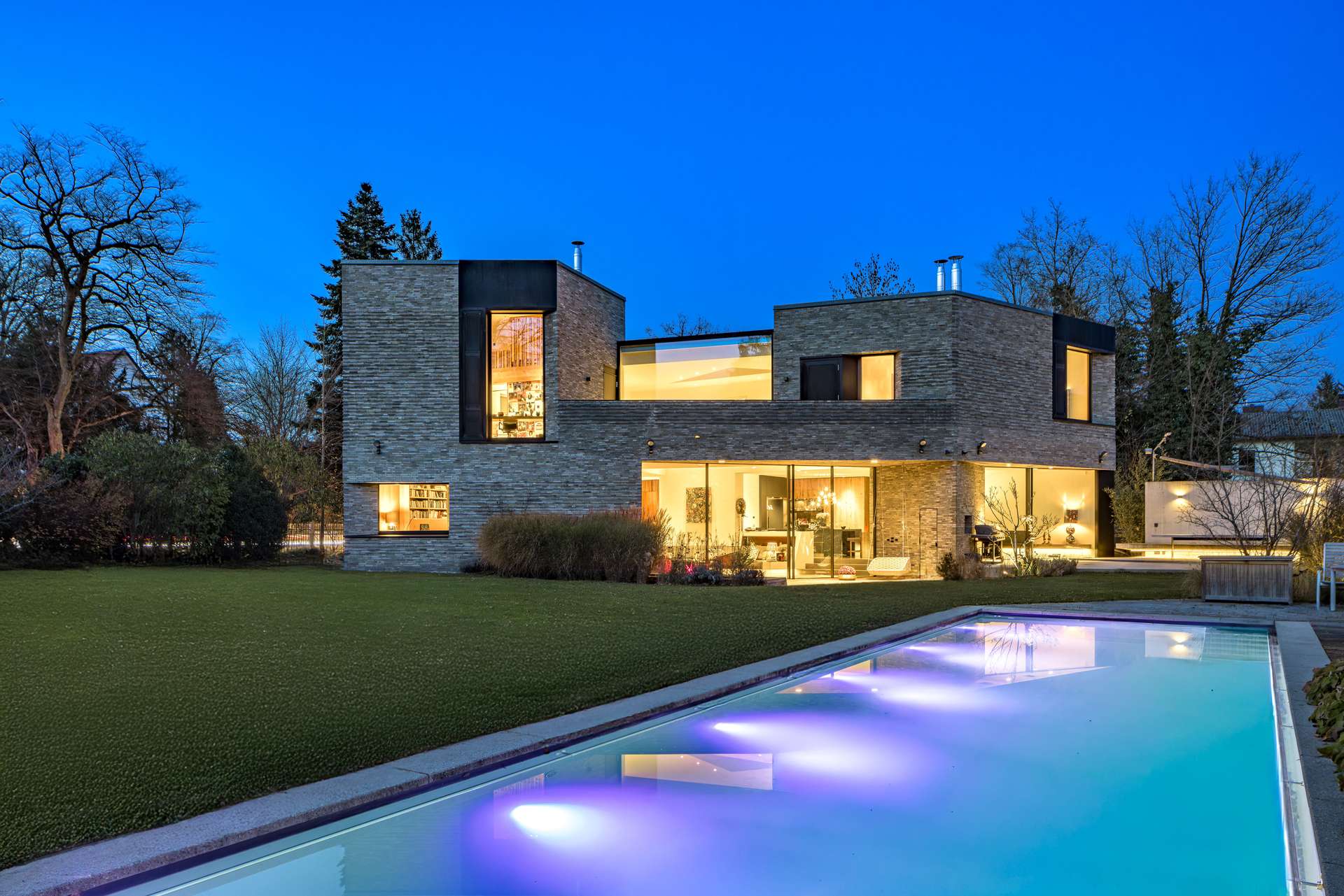 Auf einem traumhaften Eckgrundstück thront das Anwesen, deren farblich changierende Steinfassade nahezu ein burgartiges Aussehen vermittelt. Die Hauptfassade ist nach Süden zum aufwendig angelegten Garten mit Außenpool ausgerichtet, Galerien, Terrassen und großzügige Fensterflächen verweben Innen- und Außenraum. Im Inneren ist die Villa geprägt durch imposante Raumhöhen und besticht im Erdgeschoß insbesondere durch das doppelgeschossige Wohnzimmer, das durch eine leichte Absenkung auf eine Bodenmulde im großen Garten reagiert. Durch diese Absenkung entstand ein repräsentativer, sieben Meter hoher und lichtdurchfluteter Raum. Exklusive Materialien und hohe Ausführungsqualität prägen auch die Innenausstattung.