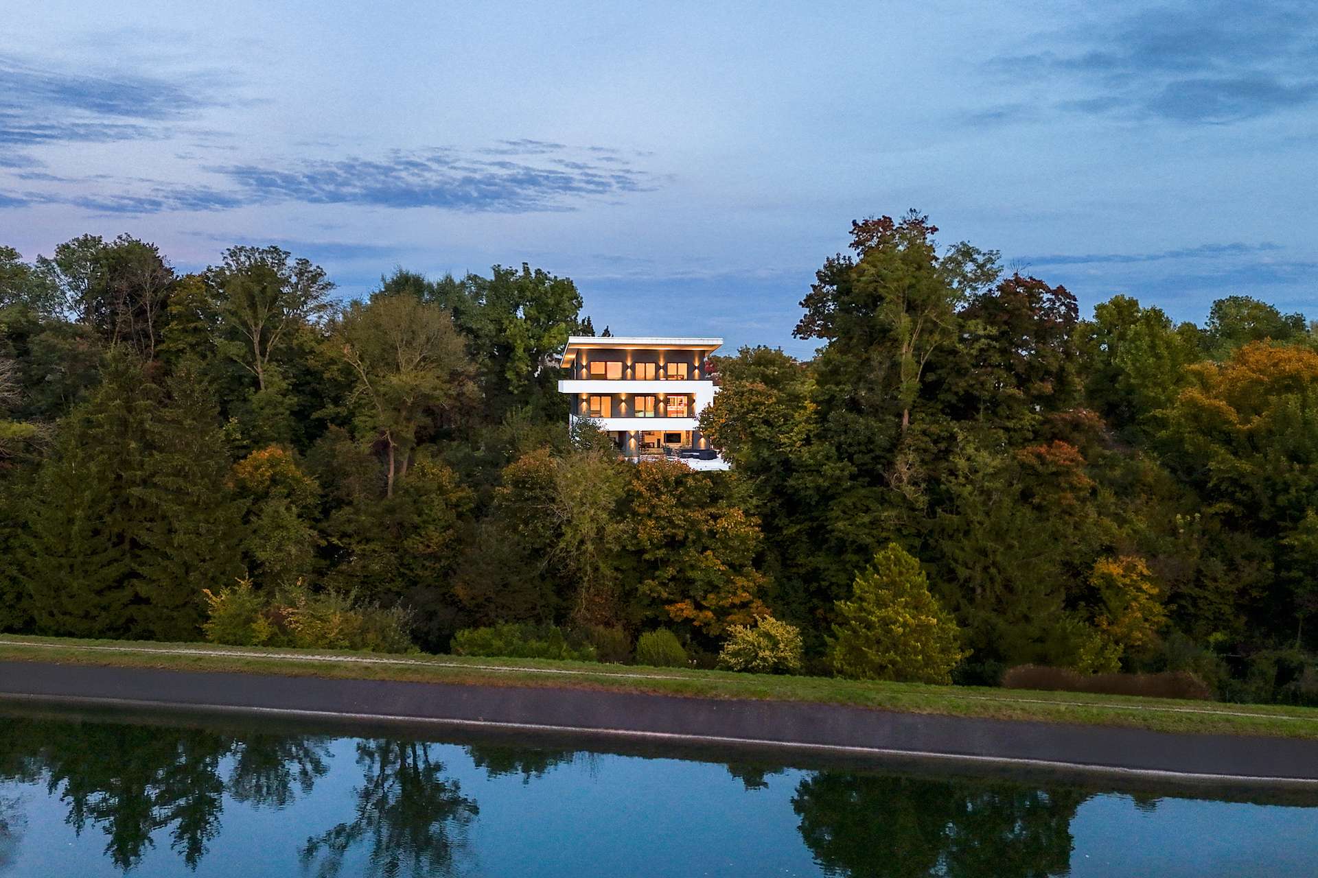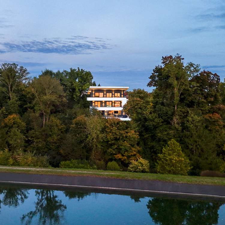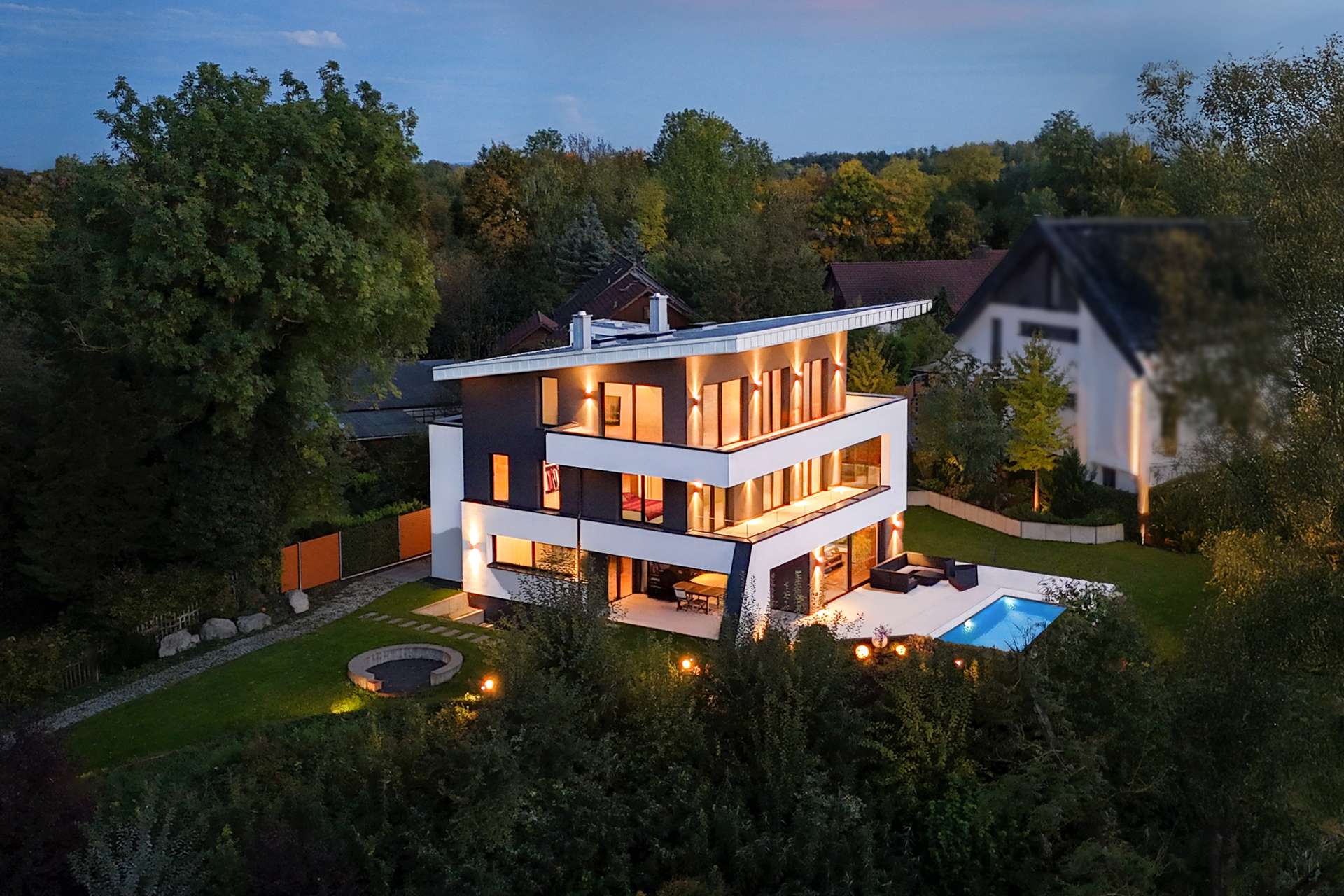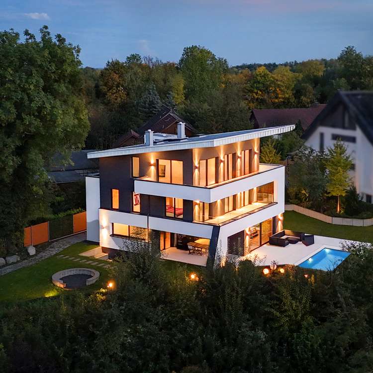 In absolut einzigartiger Lage an der nördlichen Stadtgrenze bei München-Bogenhausen, erhebt sich dieses 2019 errichtete Villenanwesen als echtes Unikat in München und Umgebung – ein Ort, der Ruhe, Naturverbundenheit und vollkommene Privatsphäre mit einem Panorama vereint, das seinesgleichen sucht. Auf einem rund 2.500 m² großen Plateaugrundstück – direkt am Isarkanal und inmitten der Isarauen – thront die imposante Villa mit klarer Formensprache und anspruchsvoller Architektur. Das Anwesen beeindruckt nicht nur durch seine exponierte Lage mit unverbaubarem Weitblick von der Frauenkirche bis zur Allianz Arena, sondern auch durch ein Höchstmaß an Gestaltungsqualität, Diskretion und Großzügigkeit. Zwei separate Eingänge – einer für Gäste mit Zugang zum großzügigen Gäste- oder Arbeitsbereich, der andere als repräsentativer Haupteingang – garantieren maximale Privatsphäre. Bereits beim Betreten des lichtdurchfluteten Wohnbereichs eröffnet sich ein atemberaubendes Raumgefühl: Panoramafenster rahmen den Blick auf die Weite der Landschaft, während ein elegant gesetzter Kamin als stilvoller Raumtrenner zwischen Wohn-, Essbereich und der offenen Designküche mit Marken-Einbaugeräten und versteckter Back Kitchen fungiert. Die beleuchtete, freischwebende Treppe ist ein weiteres Highlight und setzt den hohen gestalterischen Anspruch des Gebäudes im Inneren konsequent fort. Ein nahtloser Übergang zwischen Innen und Außen gelingt durch bodentiefe Fenster mit schwellenlosem Zugang zur überdachten Panoramaterrasse. Hier erwartet Sie ein beheizbarer, himmelblauer Infinitypool – nicht nur ein architektonisches Statement, sondern auch ein Ort der Entspannung mit spektakulärem Ausblick. Im Obergeschoss entfaltet sich der private Bereich: Ein großzügiger Masterbereich mit Ankleide, elegantem Bad und Zugang zur umlaufenden, überdachten Terrasse. Ein weiterer Hauswirtschaftsraum sorgt für kurze Wege und Funktionalität. Zusätzlich bietet diese Ebene ein separates, ruhig gelegenes Büro – ideal für konzentriertes Arbeiten mit Ausblick. Das Dachgeschoss umfasst ein stilvolles, ca. 35 m² großes Apartment mit integrierter Küchenzeile sowie ein weiteres Zimmer – beide mit Zugang zu jeweils einem hochwertig ausgestatteten En-suite-Badezimmer. Ideal als unabhängiger Gästebereich, Kinder- oder Arbeitsbereich. Ergänzt wird diese Ebene durch eine separate Dachterrasse mit sonniger Südausrichtung – ein geschützter Rückzugsort mit Weitblick Der Zugang über die Tiefgarage unterstreicht die Exklusivität des Anwesens: Fünf großzügige Stellplätze, ein separates Abteil und direkter Zugang ins Untergeschoss bieten höchsten Komfort. Auf dieser Ebene finden sich zudem ein großzügiger Hobbyraum sowie vielfältige Stauflächen. Der Außenbereich wurde mit viel Liebe zum Detail gestaltet: Der obere Teil des Plateaus bietet neben großzügigen Grünflächen eine idyllische Feuerstelle, romantisch beleuchtet und von sorgsam ausgewählter Bepflanzung umrahmt. Ein dezent geführter Gartenweg leitet in den tiefergelegenen Außenbereich – ein privater Rückzugsort am sanft fließenden Bachlauf, eingebettet in naturbelassenes Grün direkt am Isarkanal. Dort lädt ein weiterer beheizbarer Pool mit Gegenstromanlage und stimmungsvoller Beleuchtung zum Verweilen ein – besonders abends entsteht eine Atmosphäre von stiller Exklusivität. Dieses Anwesen ist weit mehr als ein Wohnsitz – eine seltene Gelegenheit, Architektur, Natur und Exklusivität in vollendeter Form zu vereinen.