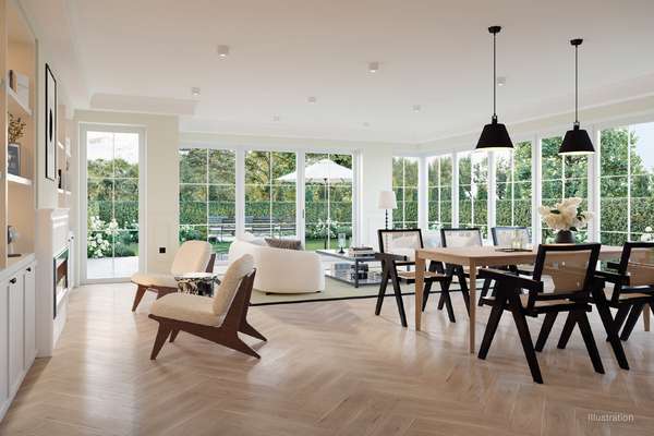 - Wohnzimmer mit großen Fensterfronten