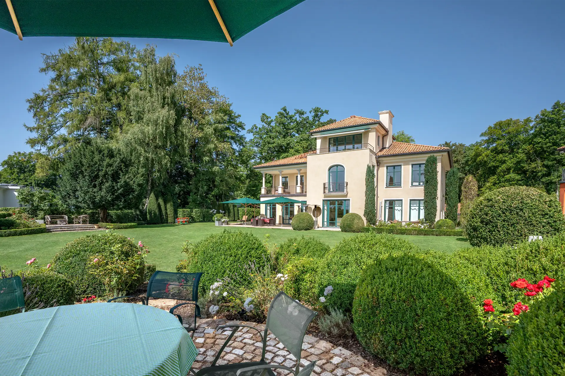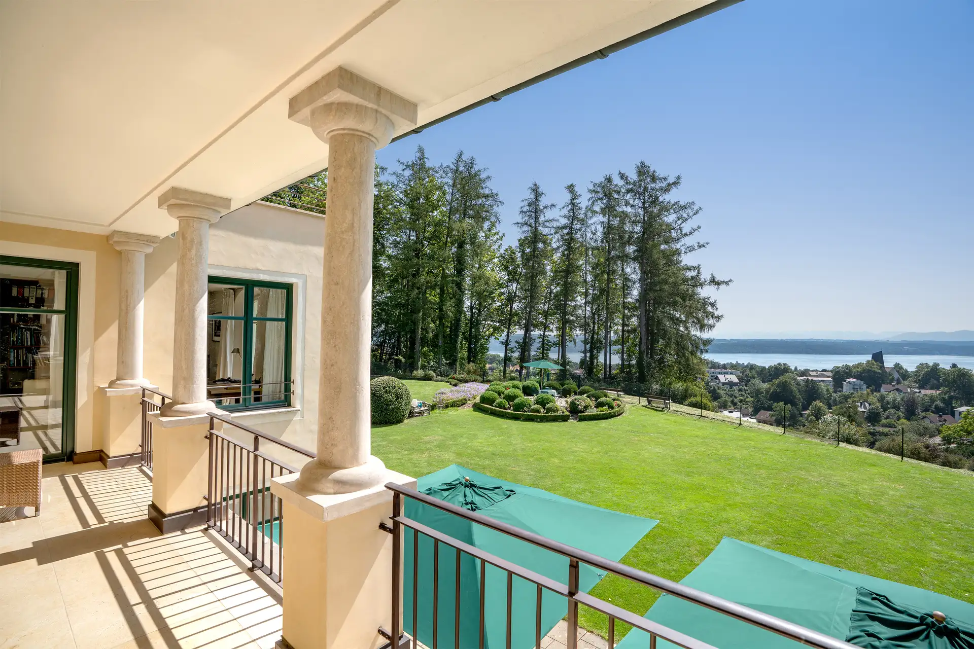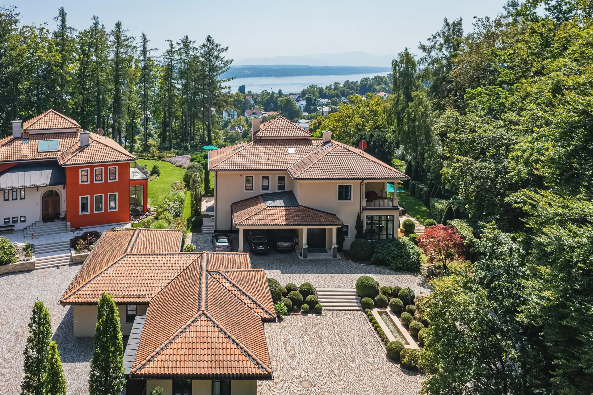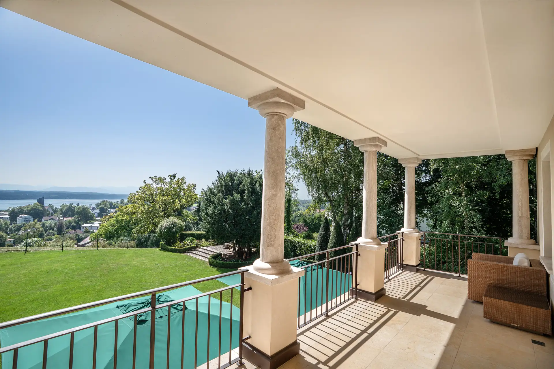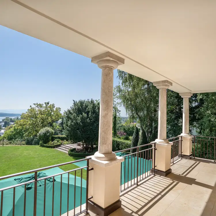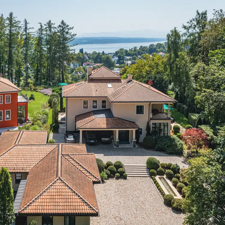 Willkommen in einer Villa, die den Traum vom exklusiven Wohnen am Starnberger See wahr werden lässt. In privilegierter Höhenlage von Feldafing gelegen, bietet diese einzigartige Immobilie einen atemberaubenden, unverbaubaren Blick über den See und die majestätischen bayerischen Alpen. Im Jahr 2008 vom renommierten Architekten Till Boodevaar entworfen und erbaut, verkörpert die Villa den eleganten, zeitlosen Stil einer toskanischen Landresidenz. Schon die repräsentative Zufahrt empfängt Sie mit einem Gefühl von Grandezza. Die großzügige, hochwertige Garage bietet nicht nur Platz für Ihre Fahrzeuge, sondern unterstreicht auch den hohen Standard des Anwesens. Das Innere der Villa besticht durch seine durchdachte Architektur und die fließenden Übergänge, die wundervolle Blickachsen schaffen. Das lichtdurchflutete Wohnzimmer samt offenem Kamin lädt zu entspannten Stunden ein und geht nahtlos in das Esszimmer über – perfekt für elegante Dinnerpartys. Die große, stilvolle Küche ist das Herzstück des Hauses. Hier findet sich nicht nur Platz für aufwendige Menüs, sondern auch ein gemütlicher Frühstücksbereich für private Momente. Mehrere Schlafzimmer bieten der Familie und Gästen Rückzugsmöglichkeiten. Der luxuriöse Masterbereich mit Ankleide und Bad en Suite ist ein privates Refugium der Ruhe. Ein Highlight für Genießer ist der grandiose Weinkeller, der das Potenzial hat, zum Mittelpunkt geselliger Abende zu werden. Der außenliegende, wunderschön angelegte Garten ist eine Oase der Ruhe und fügt sich harmonisch in die Umgebung ein. Er bietet den perfekten Rahmen, um die Natur, den Blick auf den See und die Sonne zu genießen. Zwei separate Einliegerwohnungen ergänzen das Angebot und bieten vielfältige Nutzungsmöglichkeiten – sei es für erwachsene Kinder, Personal oder zur Vermietung. Diese Villa ist mehr als nur ein Haus; sie ist eine luxuriöse Lebensart, die Eleganz, Ruhe und eine einzigartige Atmosphäre in perfekter Harmonie vereint.