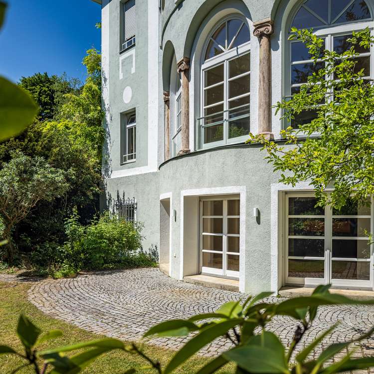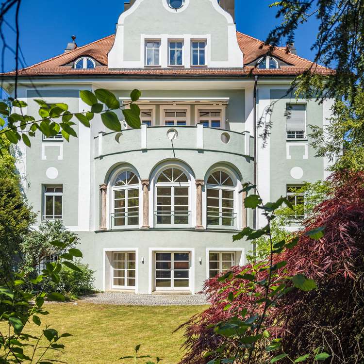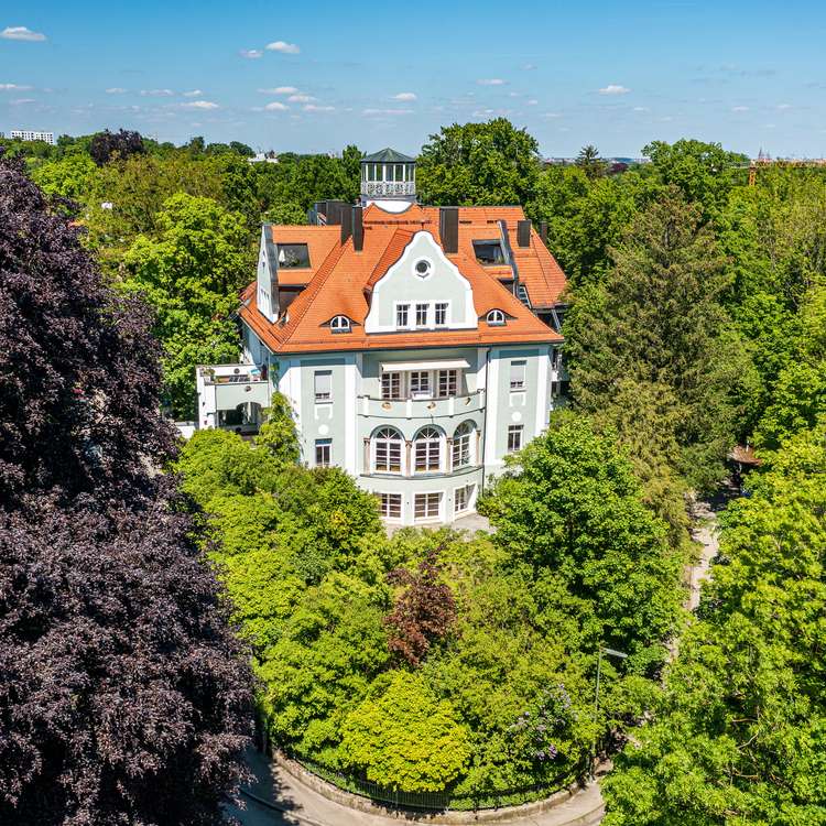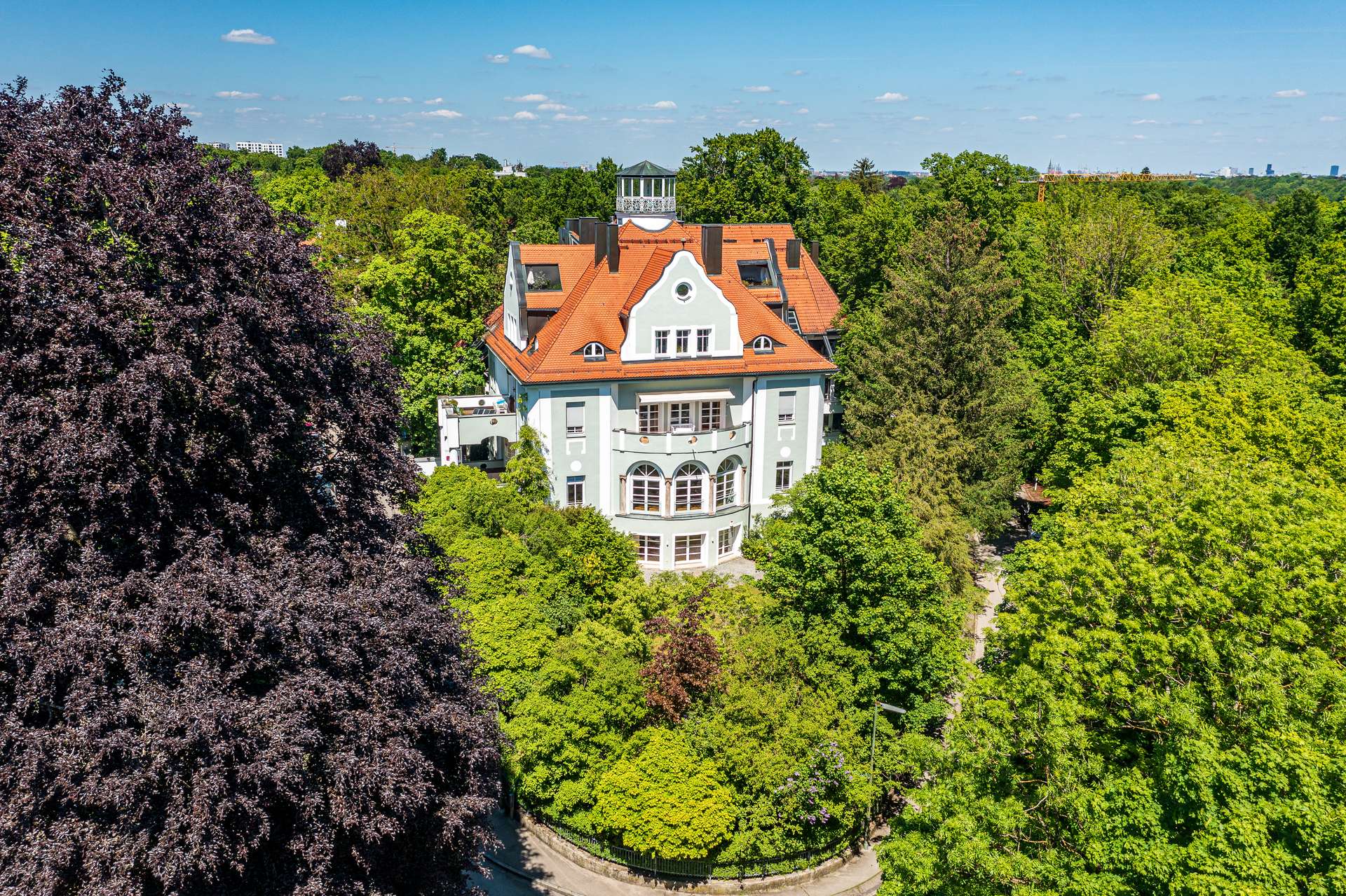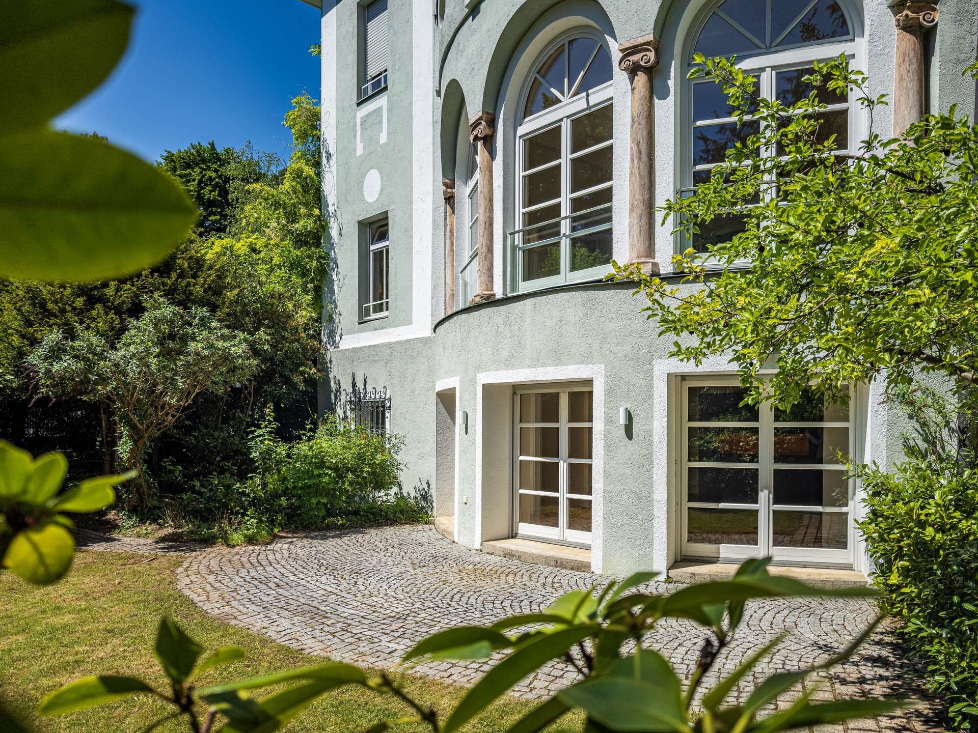 In absolut privilegierter Lage auf der historischen Prinz-Ludwigs-Höhe befindet sich diese außergewöhnliche Wohnung in einer der architektonisch bedeutendsten Jugendstilvillen Münchens. Errichtet im Jahr 1906 nach den Plänen des renommierten Münchner Architekten Max Ostenrieder, spiegelt das Anwesen mit seinen neubarocken Stilelementen, dem markanten Belvedere, dem charmanten Pergolatürmchen, der historischen Remise und dem kunstvoll gearbeiteten Schmiedeeisentor bis heute den Glanz seiner Entstehungszeit wider. Nur wenige Jahre nach Fertigstellung wurde die Villa um eine private Sternwarte mit drehbarer Kuppel ergänzt – ein architektonisches Unikat, das ihresgleichen sucht. Die zur Vermietung stehende Einheit ist die großzügigste Wohnung des Hauses und bietet mit einer Wohnfläche von ca. 288 m² (Wohn-/Nutzfläche ca. 314 m²) auf zwei Ebenen ein Raumangebot, das sowohl in seiner Großzügigkeit als auch in seiner gestalterischen Qualität höchsten Ansprüchen gerecht wird. Insgesamt sieben stilvolle Zimmer, darunter vier Schlafzimmer, drei luxuriös ausgestattete Bäder sowie ein separates Gäste-WC, schaffen ein Wohnumfeld von außergewöhnlichem Format. Charakteristisch für das Obergeschoss sind beeindruckende Deckenhöhen von bis zu 4,60 m, weitläufige, ineinander übergehende Wohnräume, klassische Flügeltüren, kunstvolle Stuckverzierungen und original erhaltene Parkettböden – Elemente, die das historische Ambiente dieser Wohnung prägen. Eine großzügige Küche mit maßgefertigter Ausstattung und Zugang zur überdachten Loggia unterstreicht den repräsentativen Charakter dieses Geschosses. Im Gartengeschoss befinden sich der elegante Masterbereich mit Bad en suite, zwei weitere Räume sowie eine separat zugängliche Einliegerwohnung mit Kitchenette und eigenem Bad. Ob als Gästetrakt, Arbeitsbereich oder Au-pair-Bereich – die vielfältigen Nutzungsmöglichkeiten bieten höchste Flexibilität. Aus sämtlichen Wohn- und Schlafräumen genießt man einen unverstellten Blick ins Grüne. Ein echtes Alleinstellungsmerkmal dieser Immobilie ist der etwa 500 m² große, zur Wohnung gehörende Garten im Sondernutzungsrecht. Die sonnige Südterrasse, die gepflegte Rasenfläche sowie alte Obstbäume und dichte Sträucher schaffen ein Höchstmaß an Privatsphäre und machen das Anwesen zu einer seltenen Rückzugsoase mitten in der Stadt. Zur Ausstattung zählen darüber hinaus ein Personenaufzug von der Tiefgarage bis ins Hochparterre, zwei Garagenstellplätze, zwei großzügige Kellerabteile sowie zahlreiche durchdachte Details wie einzeln verschließbare Terrassentüren, maßgefertigte Einbauten und Rollläden an allen Fenstern. Die Wohnanlage präsentiert sich insgesamt in sehr gepflegtem Zustand und wird von einer kultivierten Eigentümergemeinschaft bewohnt. Diese außergewöhnliche Wohnung vereint historisches Flair, großzügige Proportionen, moderne Wohnqualität und eine der besten Adressen Münchens – ein Domizil für Kenner und Liebhaber gehobener Wohnkultur.