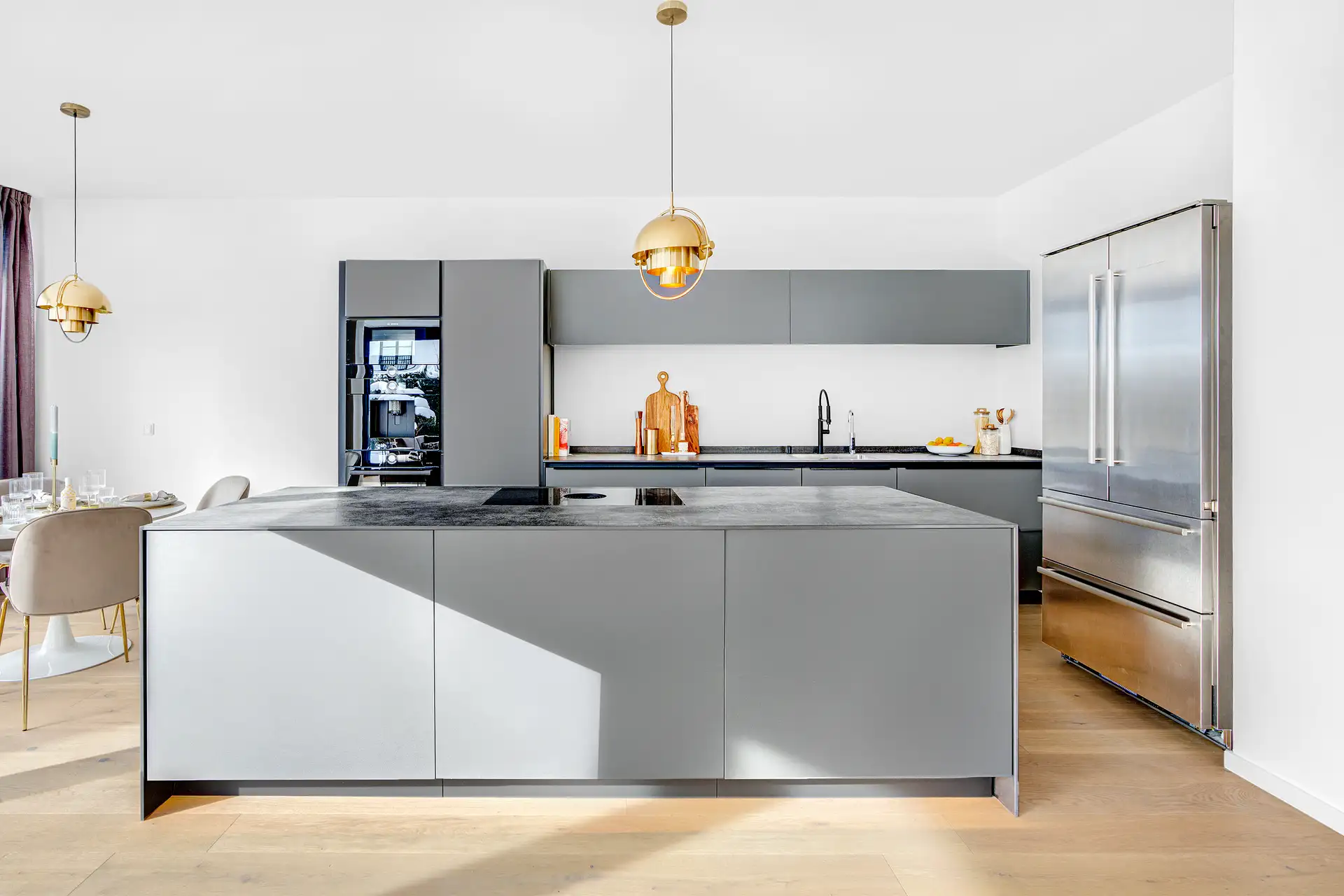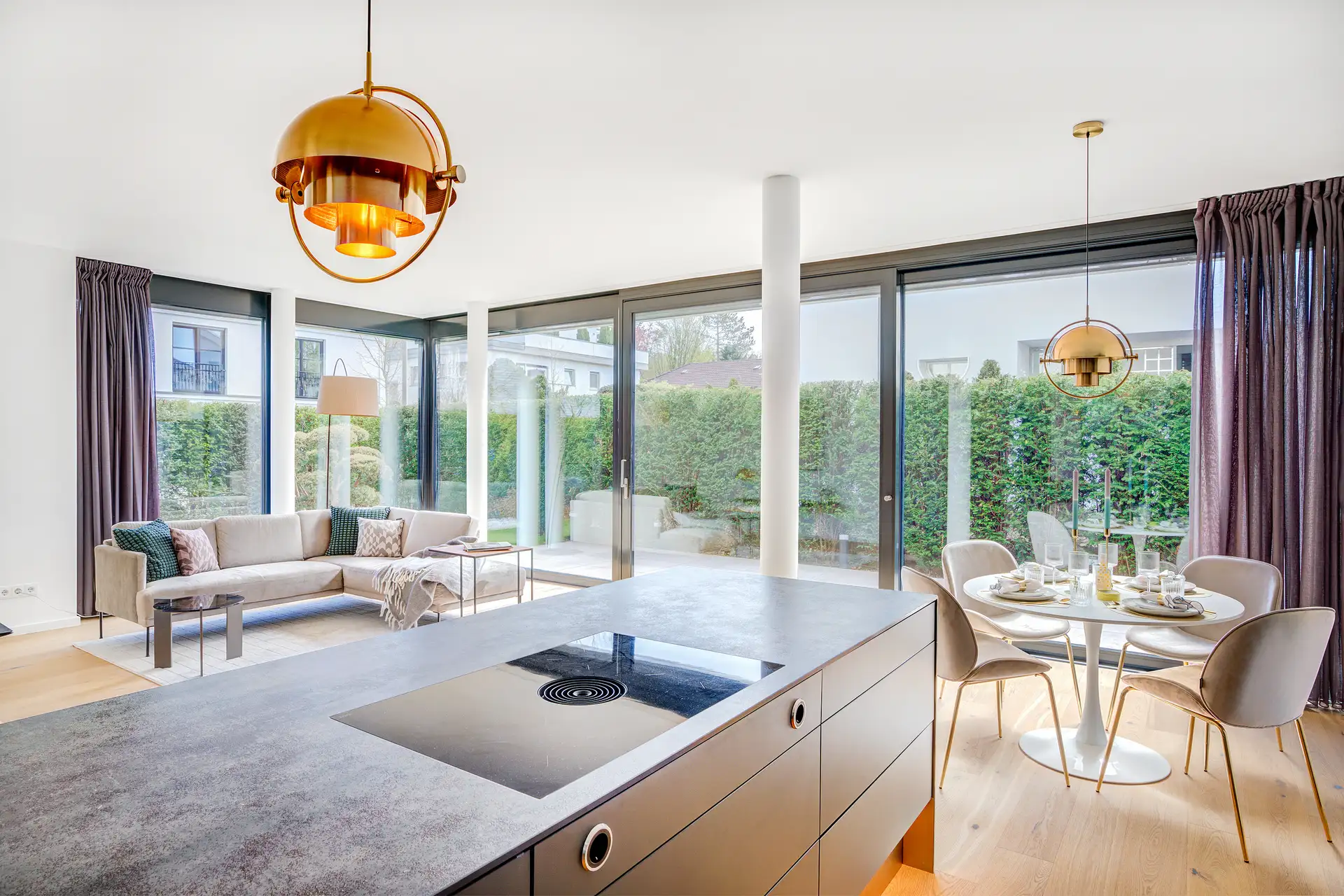 Mitten im Herzogpark gelegen befindet sich die exklusive Gartenwohnung des repräsentativen Wohnhauses, welches 2020 von dem renommierten Bauträger L-Homes fertiggestellt worden ist. Die Räumlichkeiten begeistern durch einen großzügigen und durchdacht gegliederten Grundriss mit edlen Eicheparkettböden, sowie großen, bodentiefen Fensterflächen. Das facettenreiche Raumkonzept erstreckt sich über ca. 133 m² verteilt auf 3 Zimmer, davon ein Masterbereich sowie ein Gäste-WC. Der lichtdurchflutete Wohnbereich mit offener und moderner Einbauküche mit hochwertigen Markengeräten von Gaggenau präsentiert sich als Herz der Residenz. Der ca. 55 m² große Raum vereint Wohnen, Essen und Kochen im höchsten Maß der Perfektion und überzeugt zudem durch bodentiefe Fensterfronten mit schwellenfreien Zutritt auf die privaten Außenbereiche in Süd-Ost Ausrichtung. Der Küche anschließend befindet sich der praktische Hauswirtschaftsraum. Der Masterbereich umfasst neben dem Schlafzimmer eine Ankleide und ein en-Suite Bad mit freistehender Badewanne, Walk-In Dusche und Doppelwaschbecken mit beleuchtetem Spiegelschrank. Zudem wird das Raumkonzept durch ein weiteres Zimmer mit eigener Dusche, welches als Gäste-, Kinderzimmer oder Büro genutzt werden kann, ergänzt. Im Vordergrund der gelungenen Einheit steht neben der exklusiven Ausstattung und Ausführung, der stetige Bezug zu den Außenbereichen, welche von jedem Zimmer betreten werden können. Schreinergefertigte Einbauschränke in Flur und Masterankleide, Klima- und Lüftungsgeräte, Türen mit ca. 2,20 Meter und ein KNX-System unterstreichen die Exklusivität der gelungenen Gartenwohnung. Das Mietangebot wird durch einen großzügigen Tiefgaragen Einzelstellplatz mit 230 V Stromanschluss sowie ein Kellerabteil vervollständigt.