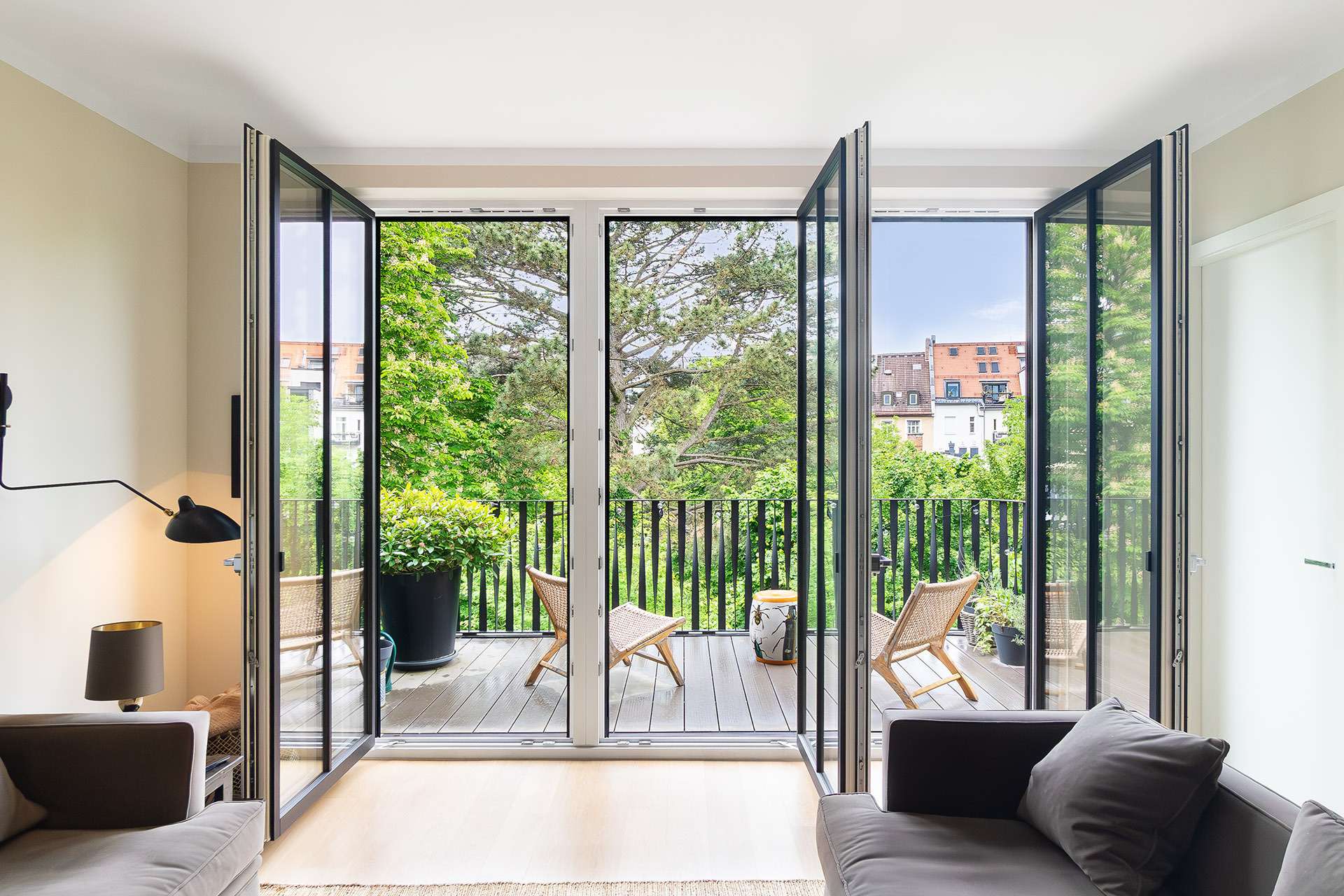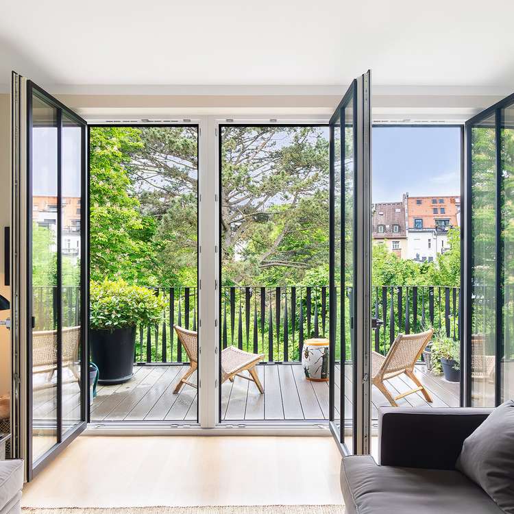 - bodentiefe Holz-Aluminium Fenster mit 3-Scheiben-Isolierverglasung und Chrombeschlägen