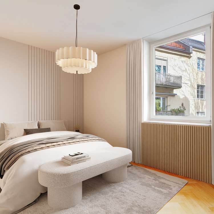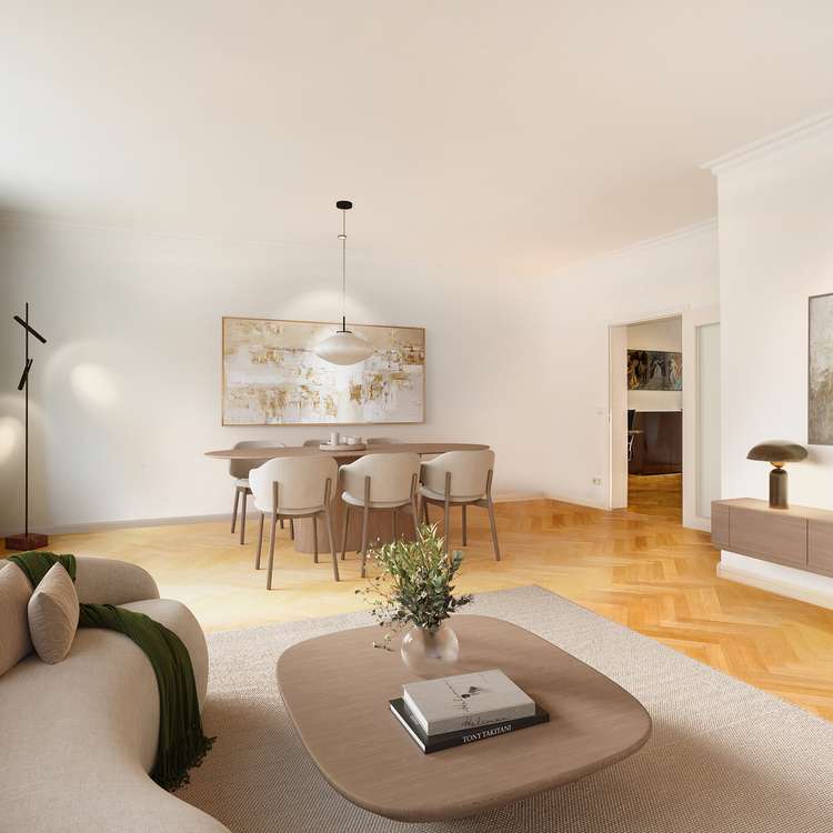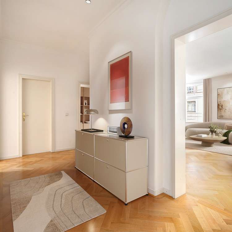 Unmittelbar am Prinzregentenplatz gelegen, befindet sich diese lichtdurchflutete Altbauwohnung im zweiten Obergeschoss eines 1908 errichteten, denkmalgeschützten Stadthauses – ein Gebäude voller Geschichte, tief verwurzelt in der Münchner Baukultur der Jahrhundertwende. Das Haus präsentiert sich in außergewöhnlich gepflegtem Zustand, Ergebnis kontinuierlicher Instandhaltung und wertschätzender Pflege, getragen von einer verantwortungsvollen Eigentümerstruktur. Schon beim Betreten entfaltet sich der unverwechselbare Altbaucharme: Hohe Decken, der elegante Chevron-Parkettboden aus Eichenholz und ein beeindruckender Tiefenblick durch die Wohnung vermitteln ein Gefühl von Geräumigkeit und Exklusivität. Eine klassische doppelte Salontür verbindet den hellen, großzügigen Wohnbereich mit dem angrenzenden Zimmer, wodurch ein besonders offenes Wohngefühl entsteht und die architektonischen Ansprüche der Jahrhundertwende wieder lebendig werden. Weitläufige Sichtachsen eröffnen den Blick vom Wohnzimmer auf den Prinzregentenplatz und die historische, denkmalgeschützte Nachbarschaft. Das Master-Schlafzimmer ist zum ruhigen Innenhof gelegen und grenzt an das Badezimmer, das mit Doppelwaschbecken und Badewanne ausgestattet ist. Die Küche bietet ausreichend Platz für eine separate Frühstücksecke oder eine noch größere, professionelle Ausstattung und öffnet sich zugleich zum Balkon, der in den begrünten Innenhof hinausführt. Zusätzlich erweitert der 24 m² große Hobbyraum im Hochparterre das Platzangebot und ist vielseitig nutzbar, etwa als Fitnessraum oder Weinkeller. Der Prinzregentenplatz ist ein Ort, an dem architektonische Klarheit, historische Substanz und der unverwechselbare Flair eines Münchner Altbaus bis heute spürbar zusammenkommen.