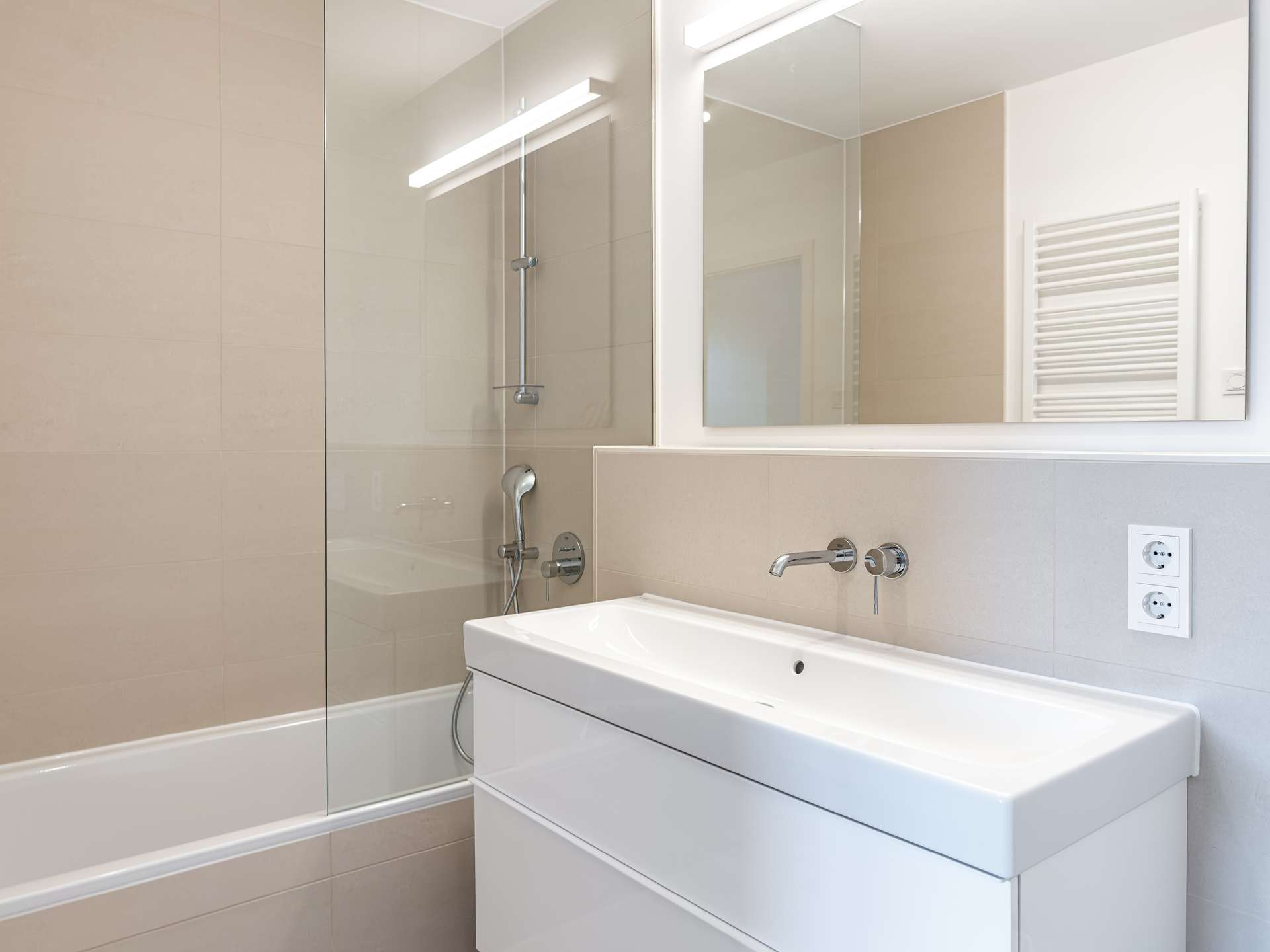 - Bäder mit großformatigen Fliesen, Badewanne und bodentiefer Regendusche