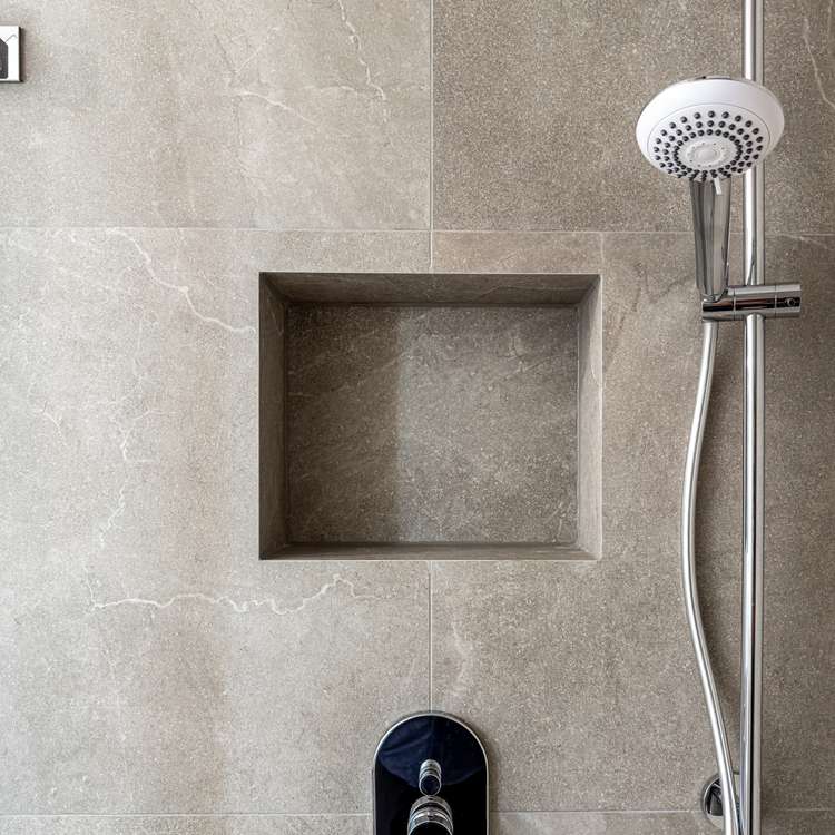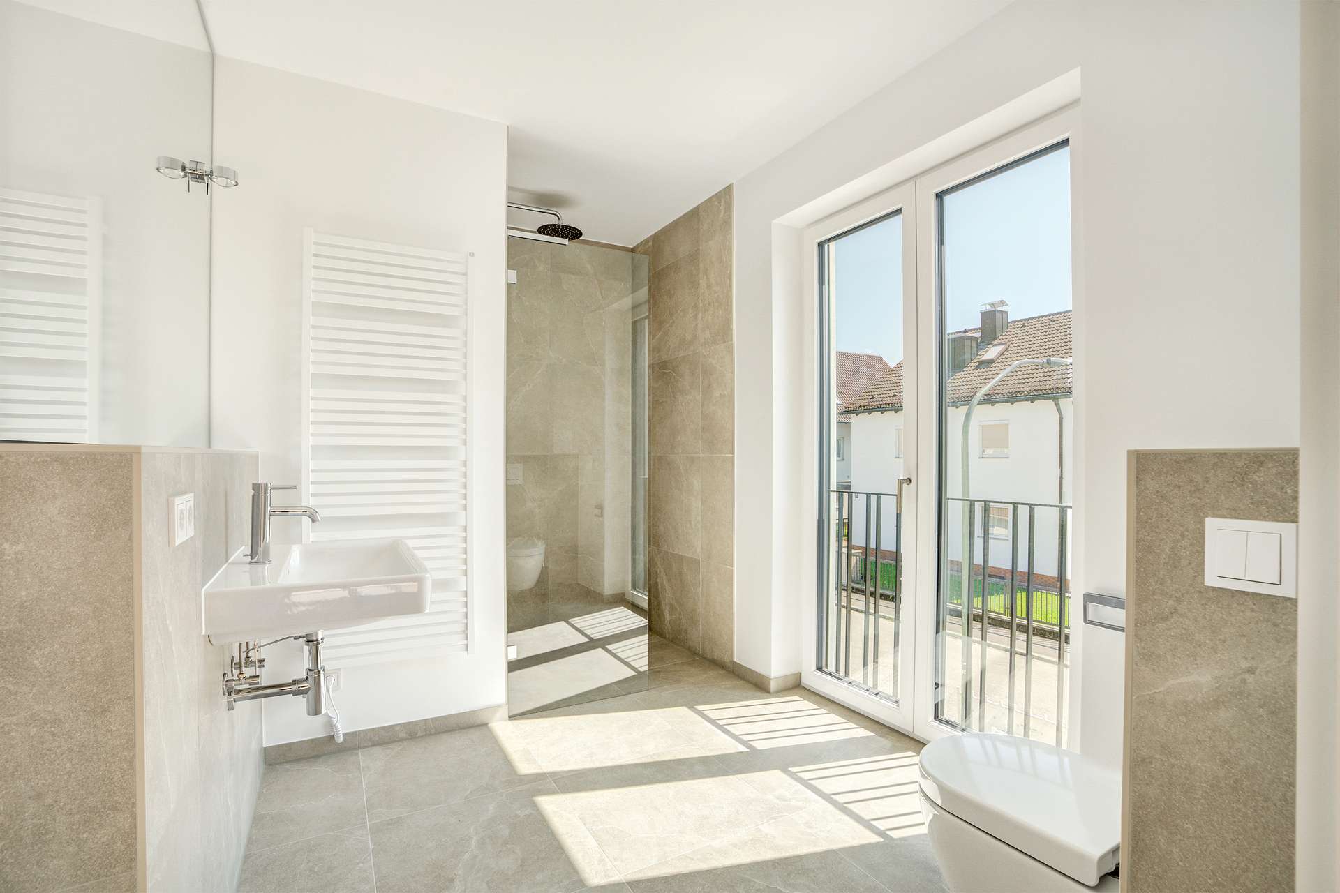 - Badezimmer en Suite mit großformatigen Feinsteinzeug-Fliesen, Regendusche mit Echtglas-Duschabtrennung sowie großformatigem Spiegel mit Designer-Beleuchtung