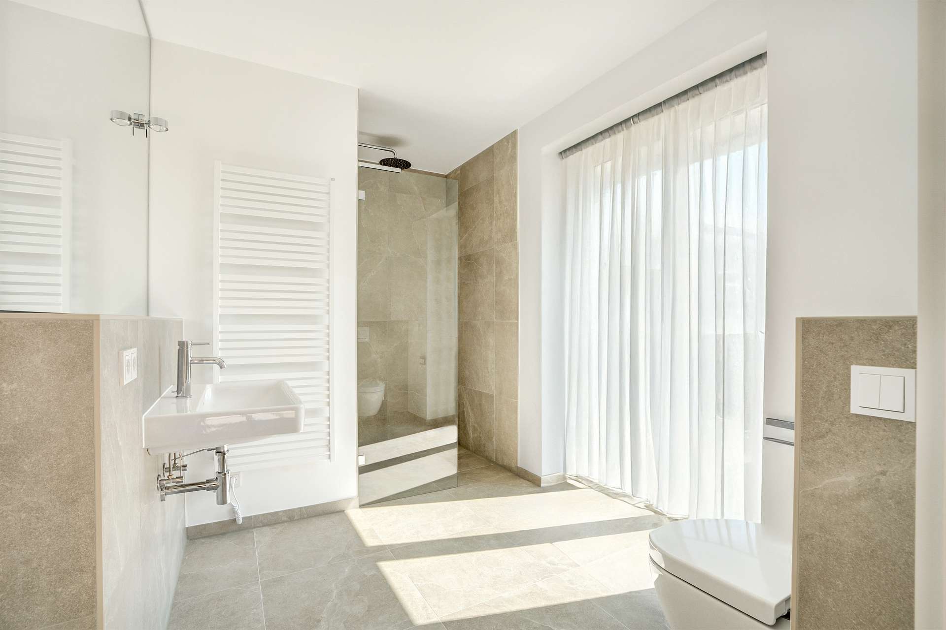 - Badezimmer en Suite mit großformatigen Feinsteinzeug-Fliesen, Regendusche mit Echtglas-Duschabtrennung sowie großformatigem Spiegel mit Designer-Beleuchtung