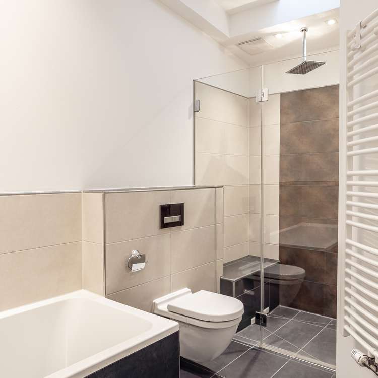 - Badezimmer im Obergeschoss mit Wanne und Dusche