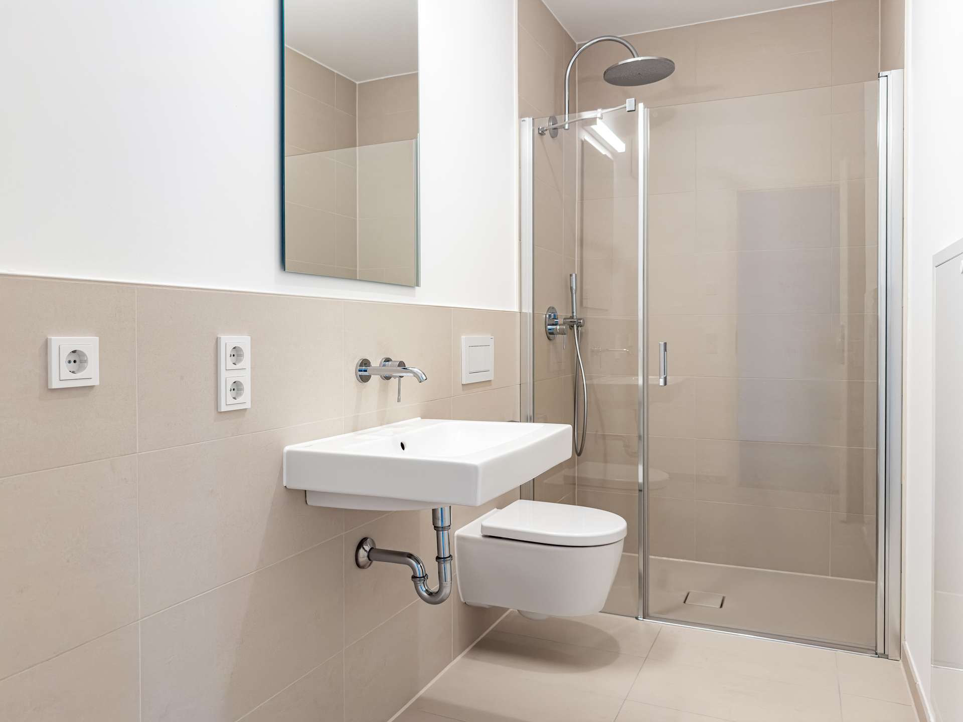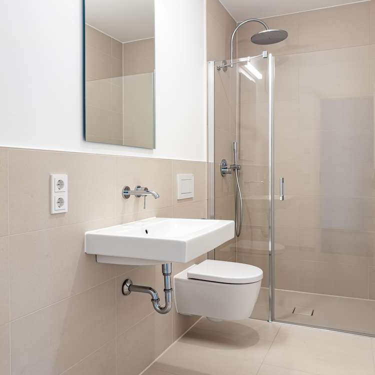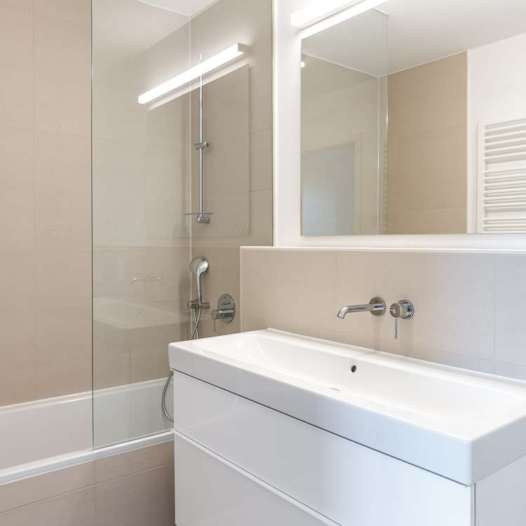 - Bäder mit großformatigen Fliesen, Badewanne und bodentiefer Regendusche