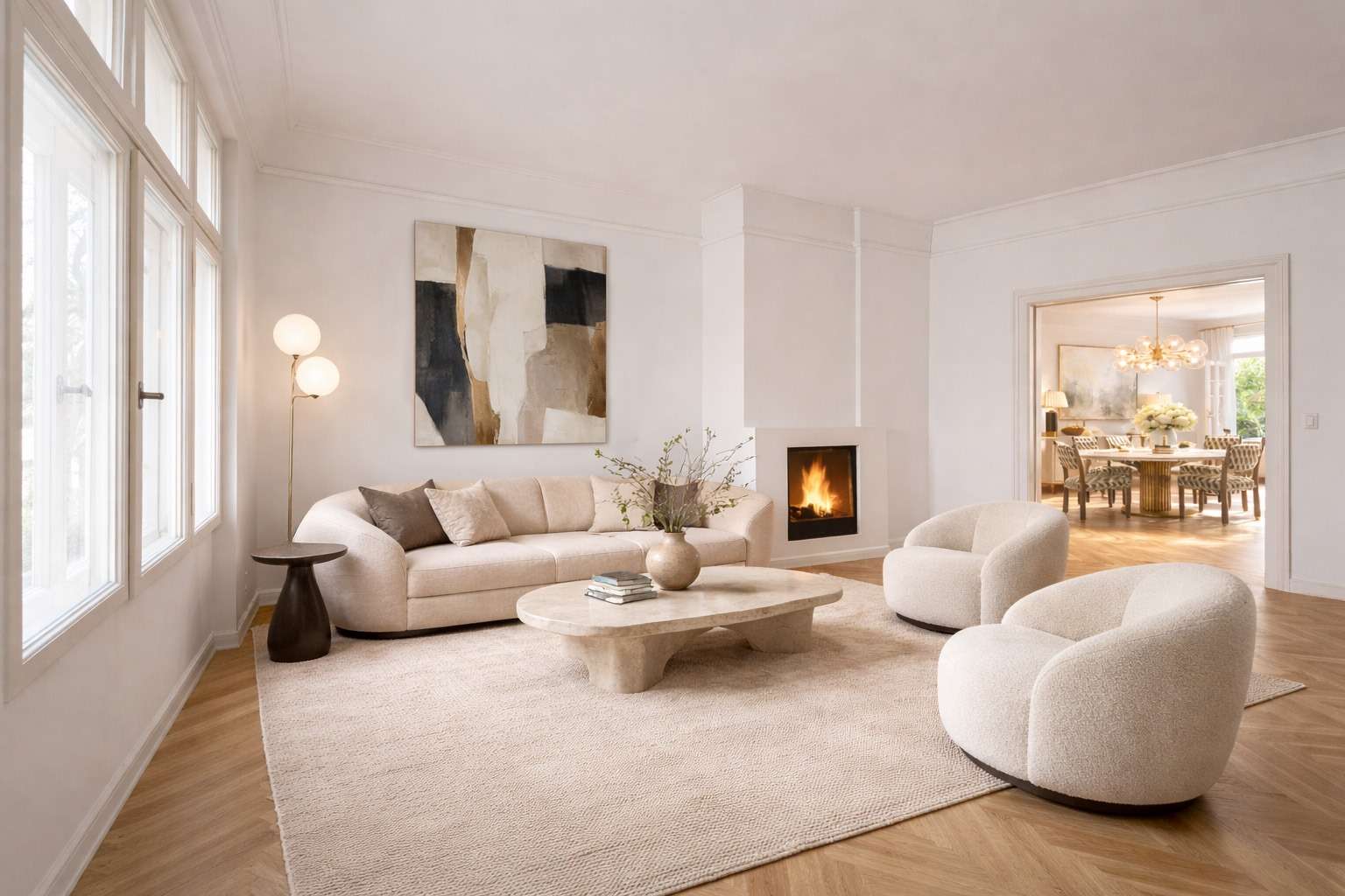 This extraordinary townhouse impressively combines the unmistakable charm of a lovingly and lavishly renovated old building with the amenities of state-of-the-art living standards - and is now available to rent for the first time. As soon as you enter the building, you are greeted by an inviting entrance area. From there, a stylishly refurbished wooden staircase leads to all floors. The first floor offers two well-proportioned rooms, a bathroom and a utility room with integrated kitchenette. This level is ideal as a separate guest or au pair area and also offers direct access to the private garden. The main floor forms the heart of the house. An impressive living room with fireplace creates a warm and prestigious living atmosphere. Adjacent is the spacious dining room with access to the open-plan kitchen and balcony. The fitted kitchen is custom-made by a carpenter and equipped with first-class brand-name appliances. Stylish, historic stucco elements underline the classic old building character of the house. On the second floor there are three flexible bedrooms and children's rooms, one of which has access to the balcony. The bathroom has been redesigned in British style and blends harmoniously into the overall concept of classic elegance and modern comfort. The third floor is reserved for the private master area and offers maximum retreat and living quality: a spacious sleeping area with balcony and adjoining dressing room as well as a luxuriously equipped en-suite bathroom with bathtub, rain shower and integrated infrared cabin create an exclusive oasis of well-being. The converted attic completes the space on offer with a light-flooded study. This special property is completed by a garage integrated into the house with parking space for one car as well as a spacious basement with boiler room and two further cellar rooms, which offer versatile and extensive storage space options. Please note that the pictures are visualizations.