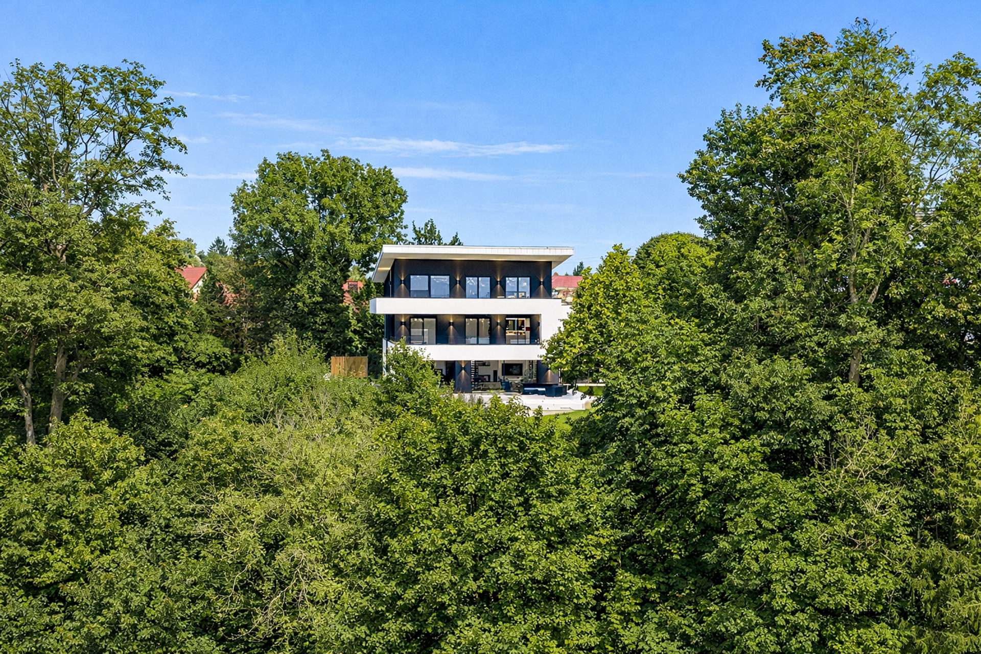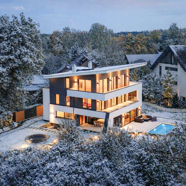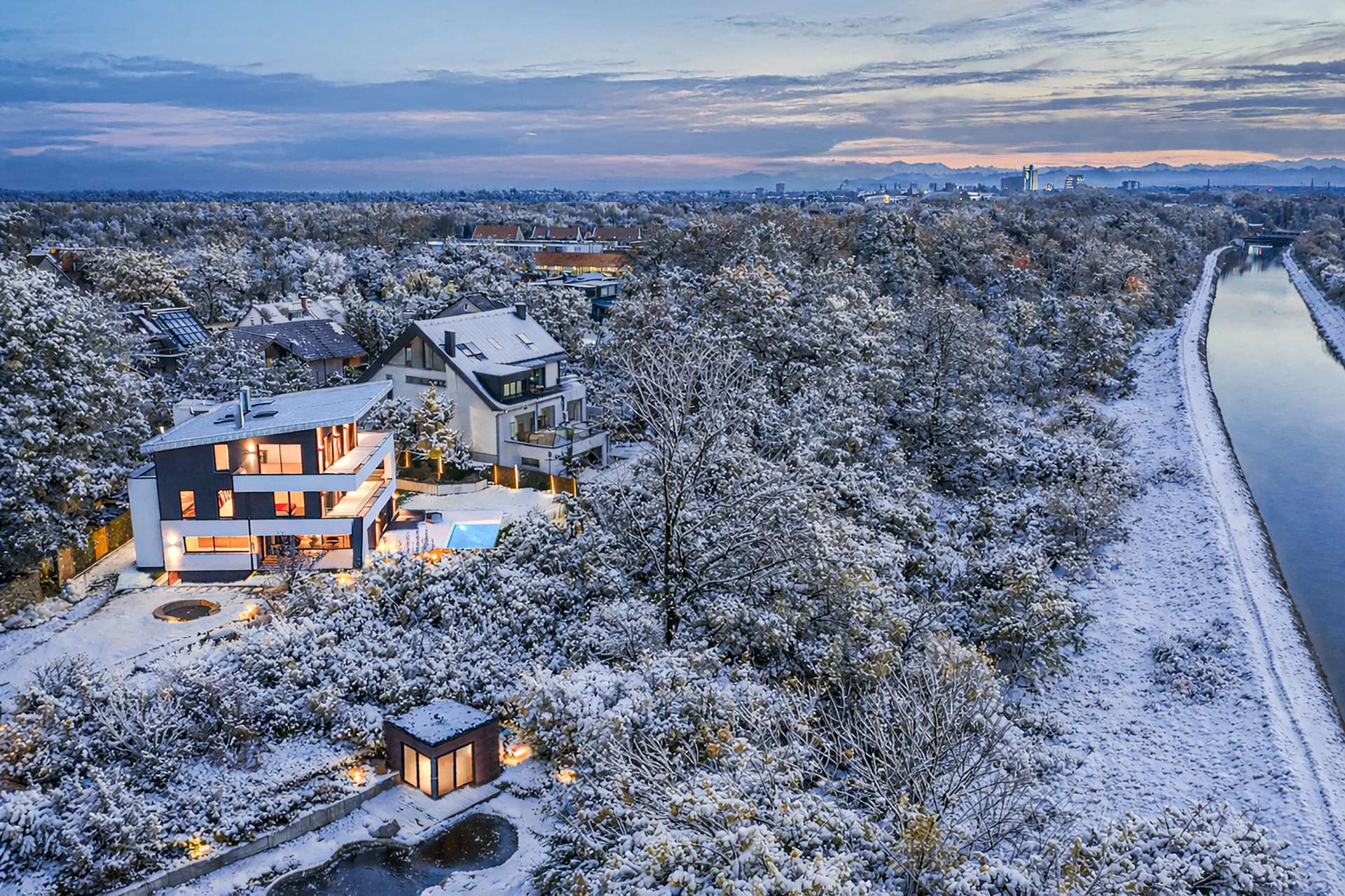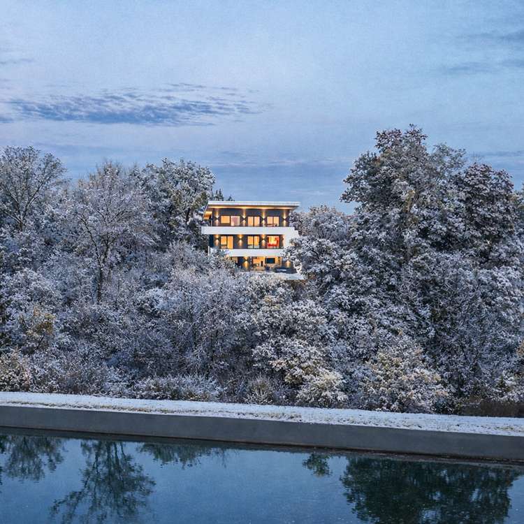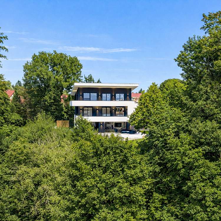 In an absolutely unique location, this villa property, built in 2019, is truly one of a kind in Munich and the surrounding area - a place that combines tranquillity, closeness to nature and complete privacy with a panorama that is second to none. The imposing villa with its clear design language and sophisticated architecture sits enthroned on a plateau plot of around 2,500 m² - directly on the Isar Canal and in the middle of the Isar floodplains. The property not only impresses with its exposed location with unobstructed views from the Frauenkirche to the Allianz Arena, but also with the highest level of design quality, discretion and spaciousness. Two separate entrances - one for guests with access to the spacious guest or work area, the other as the prestigious main entrance - guarantee maximum privacy. As soon as you enter the light-flooded living area, a breathtaking sense of space opens up: panoramic windows frame the view of the expansive landscape, while an elegantly placed fireplace acts as a stylish room divider between the living and dining area and the open-plan designer kitchen with branded built-in appliances and a concealed back kitchen. The illuminated, free-floating staircase is another highlight and continues the high design standards of the building's interior. A seamless transition between inside and outside is achieved through floor-to-ceiling windows with threshold-free access to the covered panoramic terrace. A heated, sky-blue infinity pool awaits you here - not only an architectural statement, but also a place to relax with spectacular views. The private area unfolds on the upper floor: a spacious master area with dressing room, elegant bathroom and access to the wraparound, covered terrace. A further utility room ensures short distances and functionality. This level also offers a separate, quietly located office - ideal for concentrated work with a view. The top floor comprises a stylish, approx. 35 m² apartment with an integrated kitchenette and a further room - both with access to a high-quality en-suite bathroom. Ideal as an independent guest area, children's or work area. This level is complemented by a separate south-facing roof terrace - a sheltered retreat with far-reaching views Access via the underground garage underlines the exclusivity of the property: five spacious parking spaces, a separate compartment and direct access to the basement offer maximum convenience. There is also a spacious hobby room and plenty of storage space on this level. The outdoor area has been designed with great attention to detail: The upper part of the plateau offers spacious green areas as well as an idyllic fireplace, romantically lit and framed by carefully selected planting. A discreet garden path leads to the lower outdoor area - a private retreat by the gently flowing stream, embedded in natural greenery directly on the Isar Canal. There, another heated pool with a counter-current system and atmospheric lighting invites you to linger - creating an atmosphere of quiet exclusivity, especially in the evening. This property is far more than just a residence - a rare opportunity to combine architecture, nature and exclusivity in perfect form.