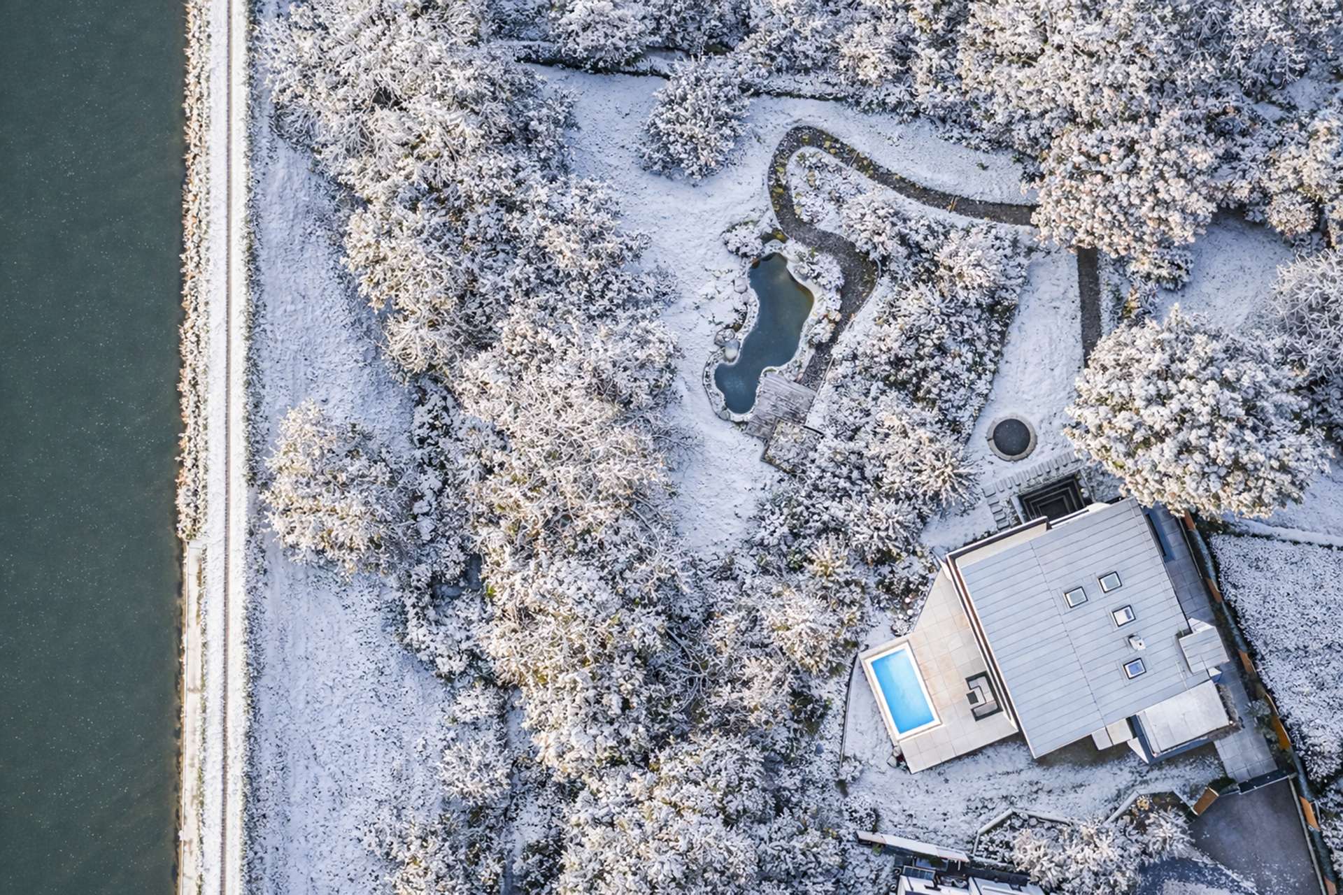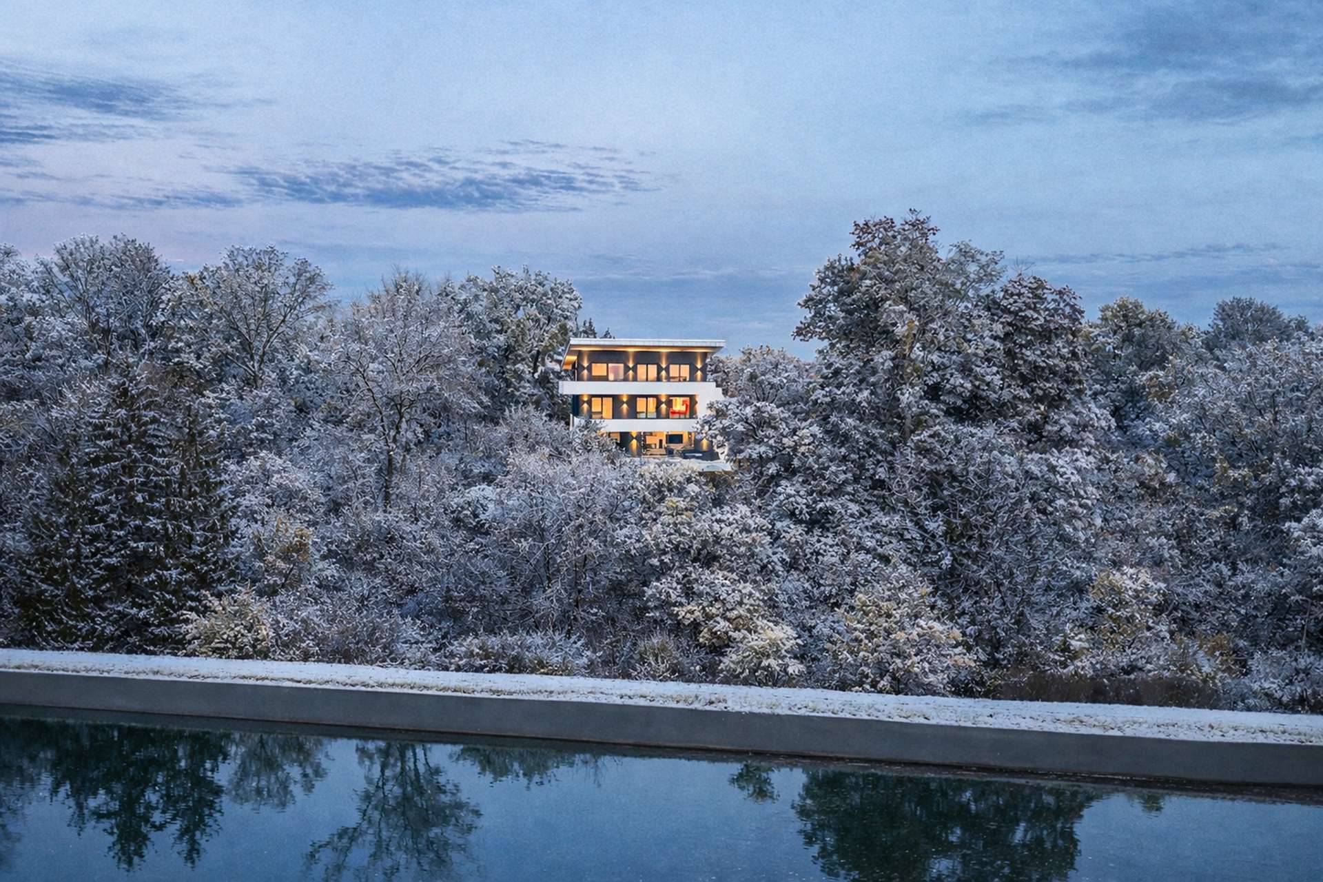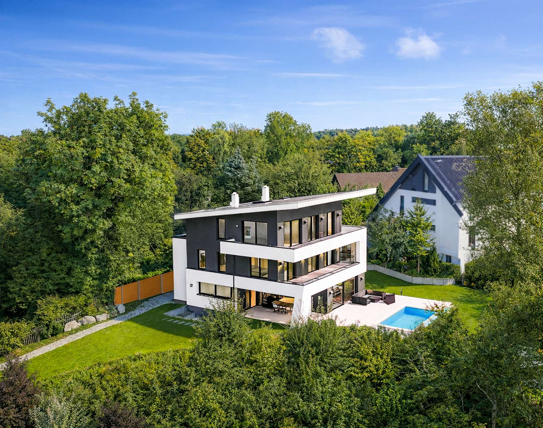 In an absolutely unique location, this villa property, built in 2019, is truly one of a kind in Munich and the surrounding area - a place that combines tranquillity, closeness to nature and complete privacy with a panorama that is second to none. The imposing villa with its clear design language and sophisticated architecture sits enthroned on a plateau plot of around 2,500 m² - directly on the Isar Canal and in the middle of the Isar floodplains. The property not only impresses with its exposed location with unobstructed views from the Frauenkirche to the Allianz Arena, but also with the highest level of design quality, discretion and spaciousness. Two separate entrances - one for guests with access to the spacious guest or work area, the other as the prestigious main entrance - guarantee maximum privacy. As soon as you enter the light-flooded living area, a breathtaking sense of space opens up: panoramic windows frame the view of the expansive landscape, while an elegantly placed fireplace acts as a stylish room divider between the living and dining area and the open-plan designer kitchen with branded built-in appliances and a concealed back kitchen. The illuminated, free-floating staircase is another highlight and continues the high design standards of the building's interior. A seamless transition between inside and outside is achieved through floor-to-ceiling windows with threshold-free access to the covered panoramic terrace. A heated, sky-blue infinity pool awaits you here - not only an architectural statement, but also a place to relax with spectacular views. The private area unfolds on the upper floor: a spacious master area with dressing room, elegant bathroom and access to the wraparound, covered terrace. A further utility room ensures short distances and functionality. This level also offers a separate, quietly located office - ideal for concentrated work with a view. The top floor comprises a stylish, approx. 35 m² apartment with an integrated kitchenette and a further room - both with access to a high-quality en-suite bathroom. Ideal as an independent guest area, children's or work area. This level is complemented by a separate south-facing roof terrace - a sheltered retreat with far-reaching views Access via the underground garage underlines the exclusivity of the property: five spacious parking spaces, a separate compartment and direct access to the basement offer maximum convenience. There is also a spacious hobby room and plenty of storage space on this level. The outdoor area has been designed with great attention to detail: The upper part of the plateau offers spacious green areas as well as an idyllic fireplace, romantically lit and framed by carefully selected planting. A discreet garden path leads to the lower outdoor area - a private retreat by the gently flowing stream, embedded in natural greenery directly on the Isar Canal. There, another heated pool with a counter-current system and atmospheric lighting invites you to linger - creating an atmosphere of quiet exclusivity, especially in the evening. This property is far more than just a residence - a rare opportunity to combine architecture, nature and exclusivity in perfect form.