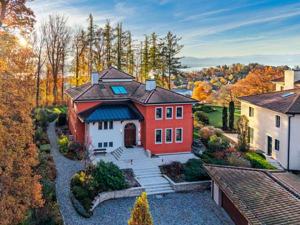 Built in 1931, the villa was completely renovated in 2013/2024 and extends over the first floor, upper floor and basement. The unique villa is surrounded by a spectacular garden landscape, a private jetty, boathouse with motorboat and terraces on both the ground and upper floors. You can expect a magnificent lakeside property, for peace and privacy in perfect condition. The open design of this exclusive villa is particularly noticeable on the first floor. The living area opens up from the entrance hall, living area, dining area with open gas fireplace, library and study area. The highlight is the generous window front that extends across the entire living area, creating a bright and inviting living atmosphere. The south-facing window front offers a view of the lake and leads to a covered outdoor seating area as well as to the villa's spacious terrace and garden. The spacious dining area offers plenty of room. The dining area is flooded with light thanks to the large windows. The dining table seats eight people. The view of the lake can be enjoyed both from the dining table and from the covered terrace, which is accessible via the dining area. The high-quality fitted kitchen, equipped with a cooking island, offers first-class brand appliances such as a gas hob, oven, dishwasher, microwave, plate warmer, ice cube machine and a BORA ventilation system. The wall and base units offer plenty of storage space for glasses and crockery. Upstairs is the master bedroom with a spacious dressing room, fitted wardrobes and en suite bathroom. Equipped with a steam bath, bathtub, shower and a separate shower toilet (Geberit). Each of the two guest bedrooms on the upper floor is elegantly designed and has an en suite bathroom - with shower or bathtub, both with WC. All bedrooms on the upper floor are equipped with air conditioning. The master bedroom and one of the guest rooms have a private south-facing terrace and offer a fantastic view of the lake. On the first floor there is a further guest apartment with en suite bathroom, shower and WC. This unit is accessible from the outside via a separate entrance. In the basement there is also a practical laundry and drying room, two pantries, a workshop and the building services. The property is supplied with natural gas and mains water. The exterior of the villa is impressive. A covered outdoor seating area with radiant heaters, a remote-controlled fountain, a private jetty with a spacious platform and a beach chair offer maximum comfort. Maintenance of the garden is facilitated by an automated irrigation system, which is supplied with groundwater, and two electric lawn robots. The boathouse of the villa on Lake Teupitz, which is connected to Berlin by the federal waterway, has an electric slipway and offers sufficient space for the motorboat, which can be launched into the water by remote control and is accessible through a roller shutter. The double garage on the property is equipped with remote control and an electric roller shutter. The villa is being sold with all the furnishings, which are included in the purchase price. Only the owner's personal belongings will be removed.