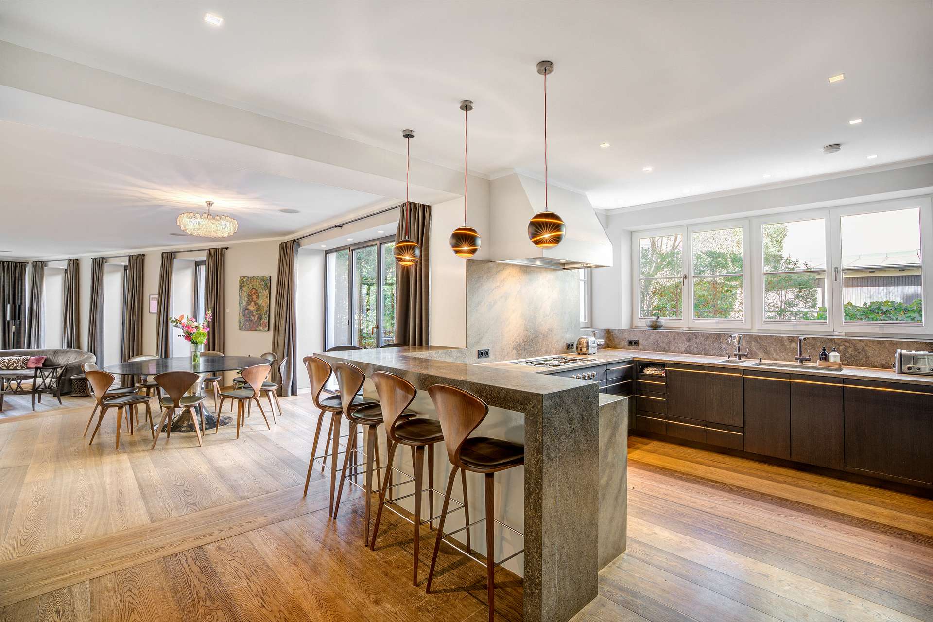 In one of Schwabing's most sought-after and at the same time quietest residential areas, this extraordinary ensemble villa presents itself as a harmonious combination of urban quality of life and private oasis of retreat. Embedded in a mature environment and yet pleasantly shielded from the hustle and bustle of the city, the house impresses with its spaciousness, elegance and exceptional living comfort. On three levels, which are connected by a stylish staircase and an elevator, a well thought-out room concept unfolds with a total of eight spacious rooms and four comfortably equipped bathrooms. The heart of the house is the very large and comfortably equipped kitchen with a communicative kitchen counter. From here, the view sweeps over the spacious living and dining area with open fireplace and into the garden. The terrace is ideal for relaxed outdoor barbecues. A special highlight is the roof terrace, which offers additional open-air space - whether as a private sun lounge or as a place for cozy summer evenings. A Finnish sauna also offers relaxation and regeneration. In the basement, there is enough space for a fitness area and storage areas. This ensemble villa combines a central location with absolute tranquillity and is a rare and very private domicile for a large family thanks to its generous amount of space. A rare offer with class in one of Munich's most popular districts.