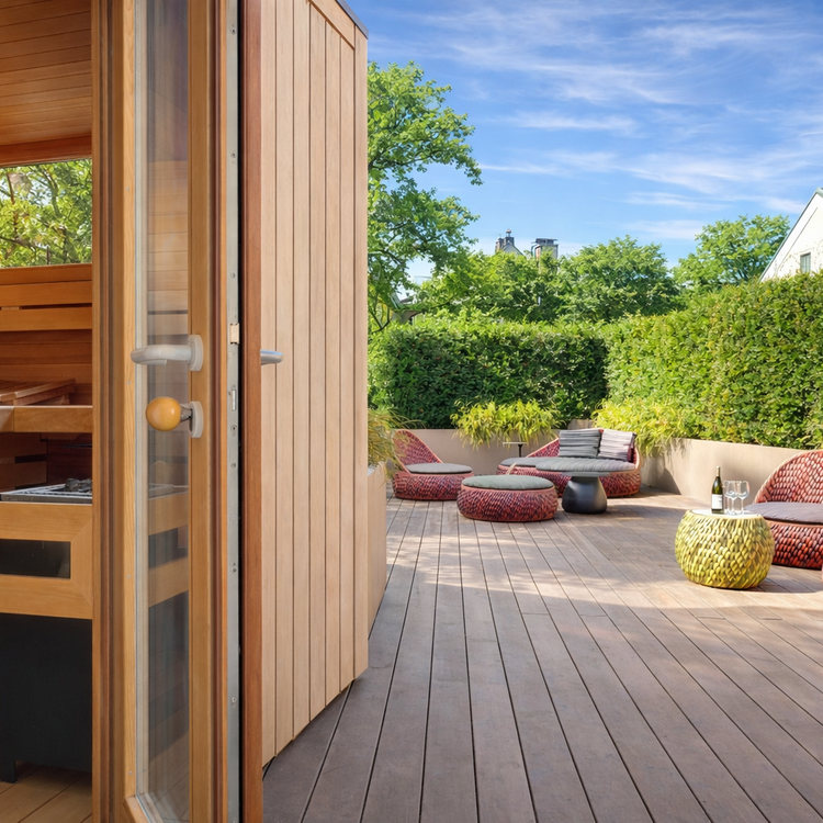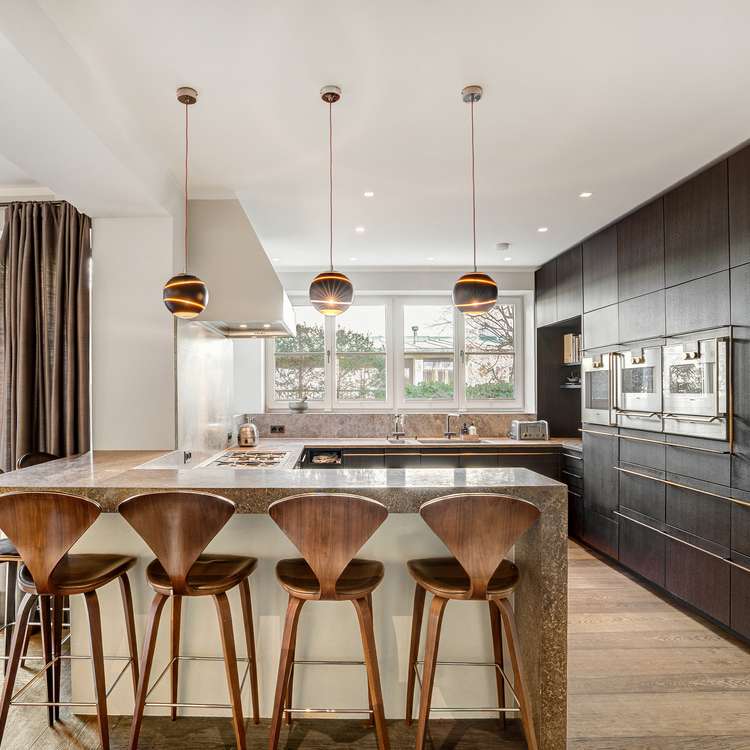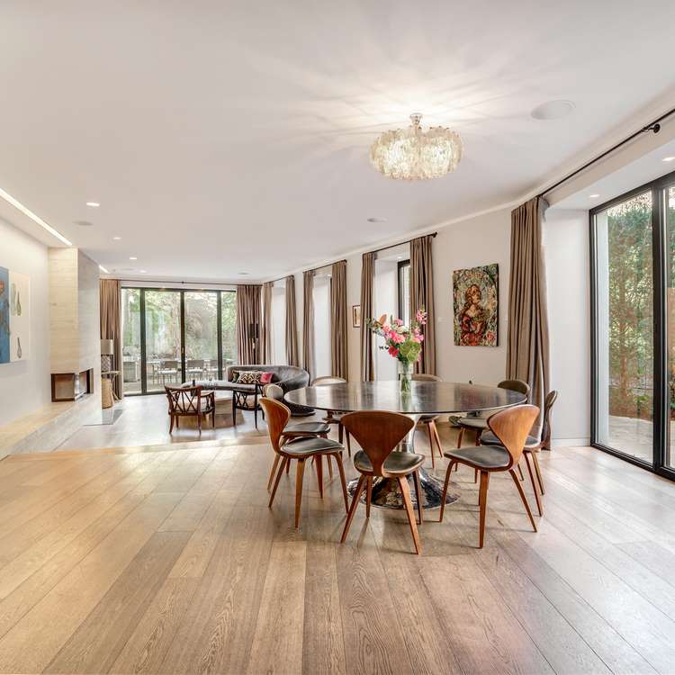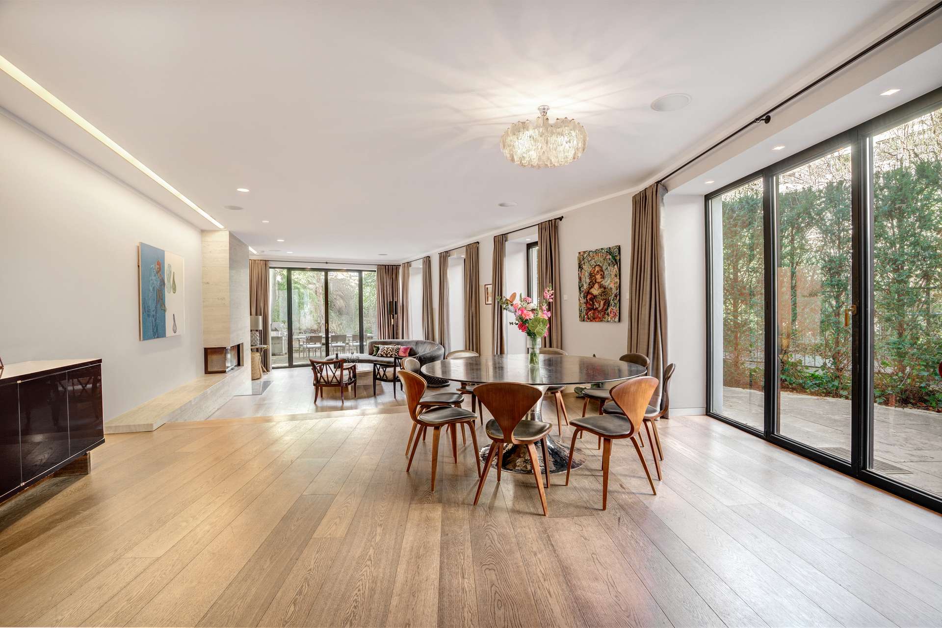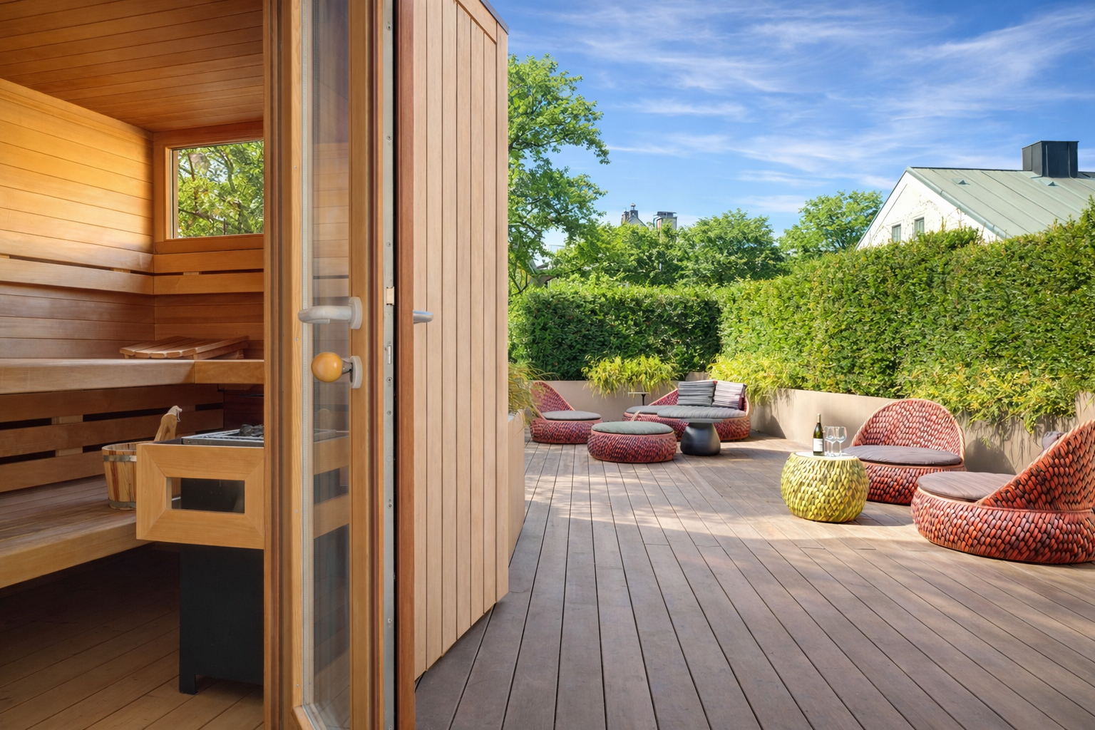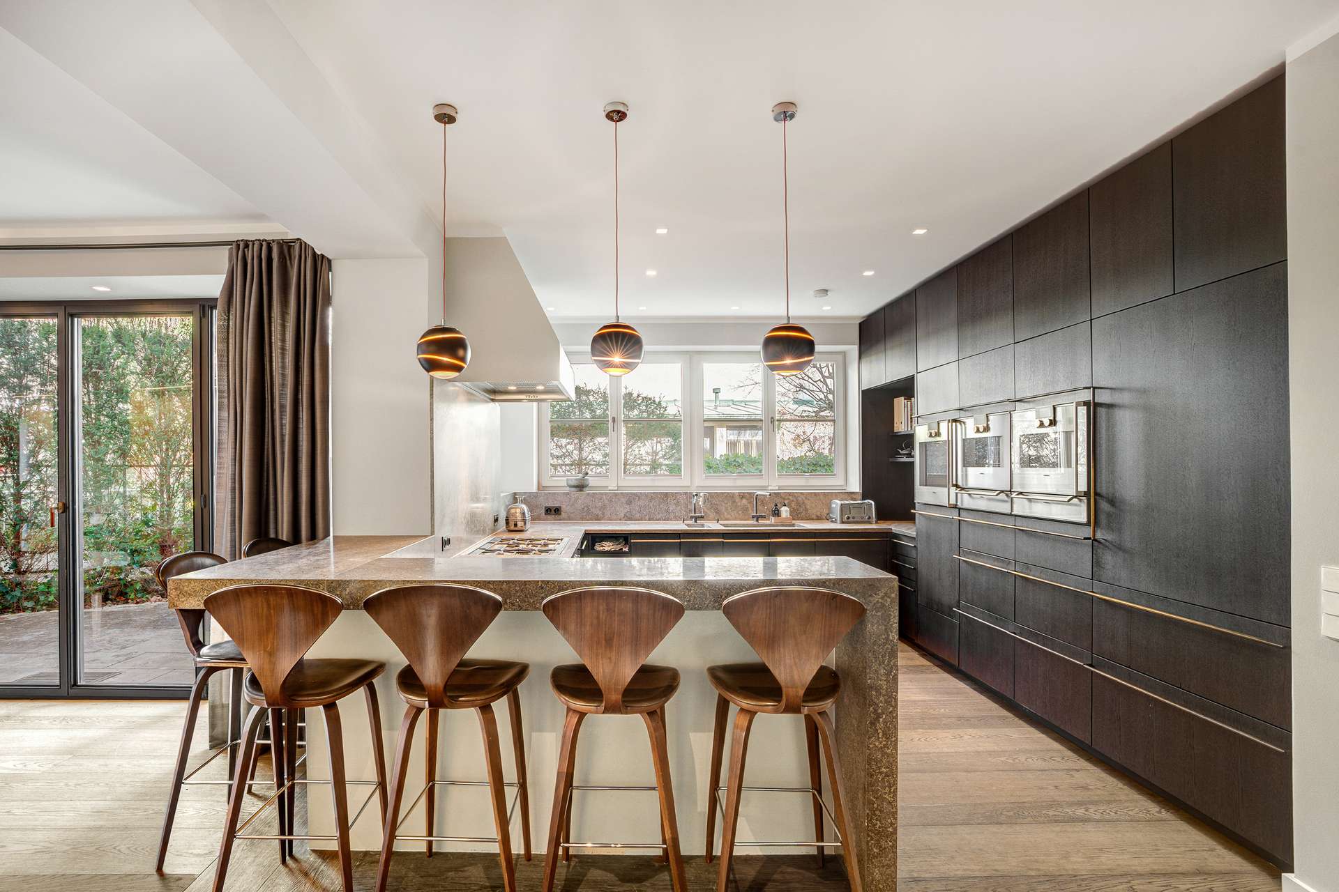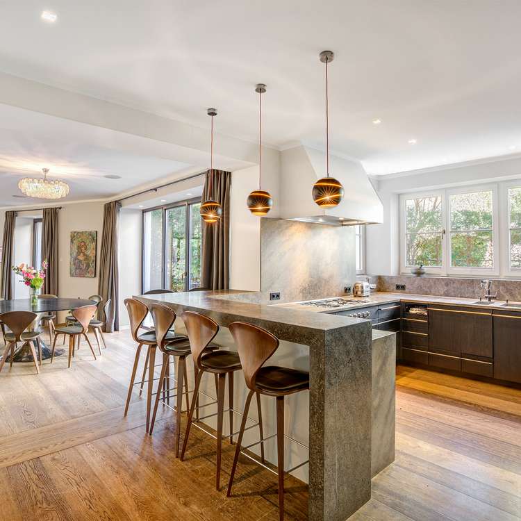 Highlights / fittings: - Large roof terrace - Finnish sauna on the roof terrace - Enclosed, sheltered garden - Spacious living/dining and cooking area of more than 100 m² - Large, floor-to-ceiling windows throughout the living/dining area - Modern marble fireplace with glass corner pane - Oak/parquet and floorboards throughout the house - High-quality natural stone worktops in the kitchen