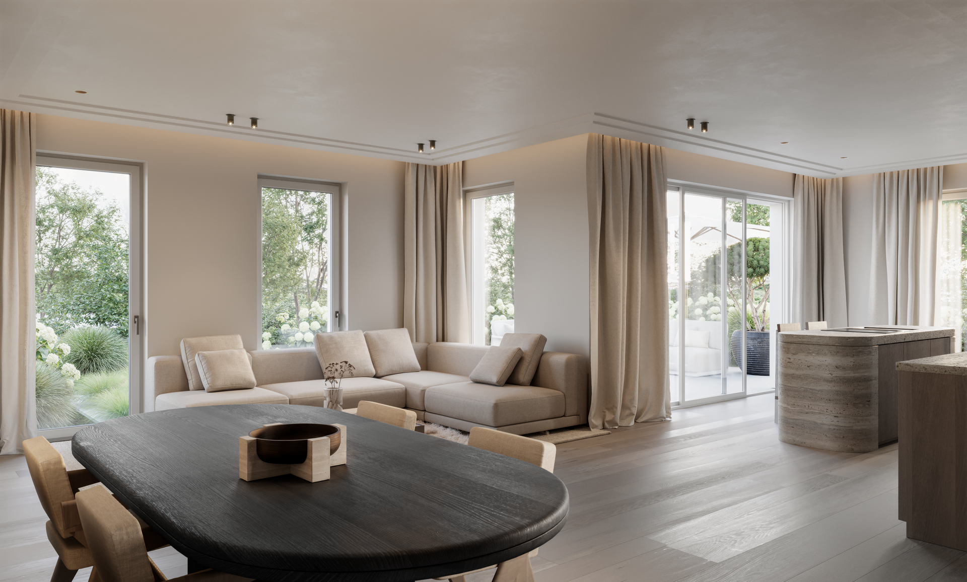 Diese hochwertige Erdgeschosswohnung vereint stilvolles Wohnen mit modernem Komfort auf ca. 130 m² Wohnfläche. Sie zeichnet sich durch ihre exklusive Ausstattung und durchdachte Raumaufteilung aus: Der offen gestaltete Wohn- / Essbereich ist ein echtes Highlight und bietet direkten Zugang zur südlich ausgerichteten Terrasse, die nahtlos in den geschmackvoll gestalteten Garten übergeht. Hier lassen sich entspannte Stunden im Freien genießen. Der Masterbereich umfasst ein großzügiges Schlafzimmer, eine Ankleide sowie ein elegantes Masterbad en suite, das höchsten Komfort garantiert. Zusätzlich stehen ein Gäste-WC sowie ein Garderobenbereich zur Verfügung, die über den Flur zugänglich sind und sich harmonisch in das Wohnkonzept einfügen. Hochwertige Natursteine sorgen für eine langlebige und edle Optik, während das Eichenparkett natürliche Wärme und zeitlose Eleganz ausstrahlt. Ein Aufzug führt Sie bequem direkt von der Wohnung ins Untergeschoss, wo sich ein gemeinschaftlicher Gang befindet, der den Zugang zu Ihrem zusätzlichen privaten Bereich ermöglicht. Alternativ können Sie auch die Treppe in Ihrer Wohnung nutzen, um direkt in die Diele des Bereichs zu gelangen. Dieser umfasst ein weiteres Badezimmer, einen praktischen Hauswirtschaftsraum sowie ein separates Zimmer, das flexibel als Gästebereich, Fitnessraum, Arbeitszimmer oder für ähnliche Zwecke genutzt werden kann. Der große Lichthof sorgt für ausreichend Sonnenlicht und schafft eine angenehme Atmosphäre. Für zusätzlichen Stauraum steht ein privates Kellerabteil im zweiten Untergeschoss zur Verfügung. Des Weiteren verfügt die Wohnung über eine Tiefgarage mit insgesamt 8 Stellplätzen. Der Preis eines Stellplatzes beträgt 95.000 €.